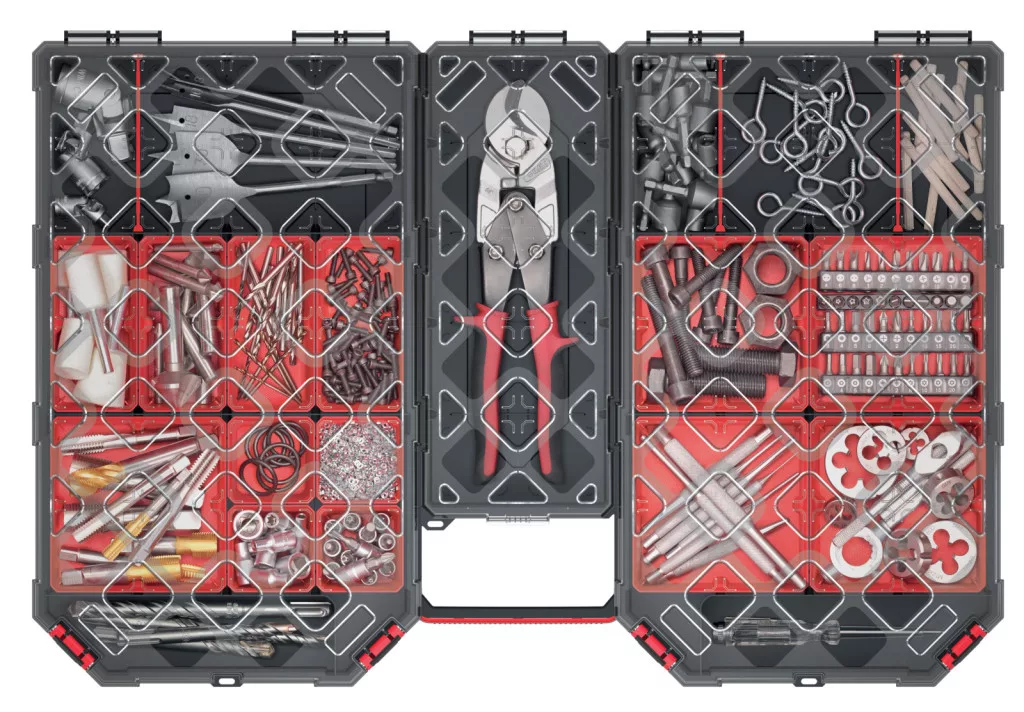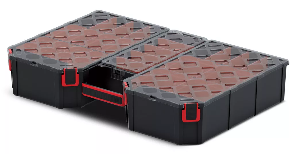 Professzionális szerszámrendező 22 kivehető tárolórekesszel és 6 állítható válaszfallal, átlátszó polikarbonát fedéllel a könnyű áttekinthetőségért.