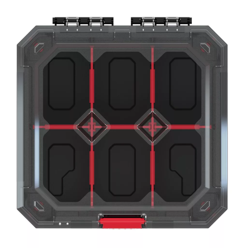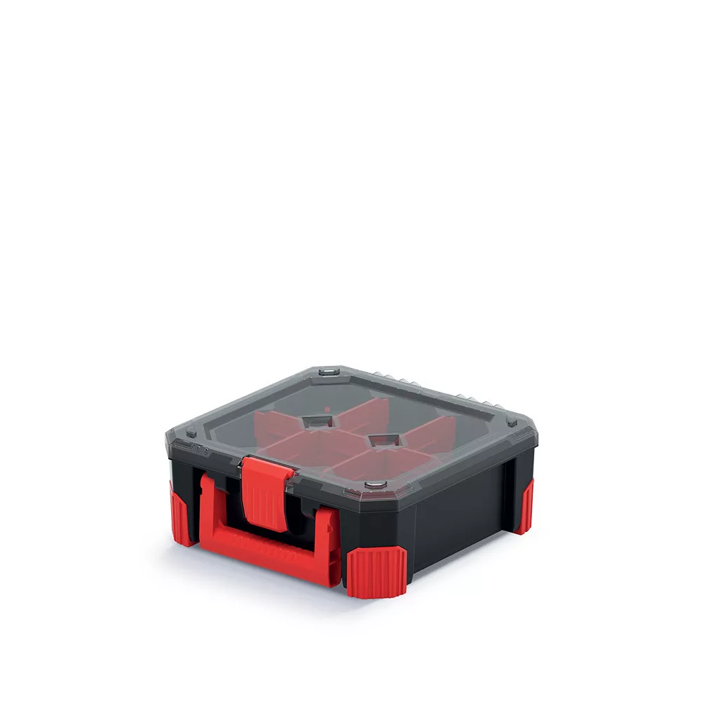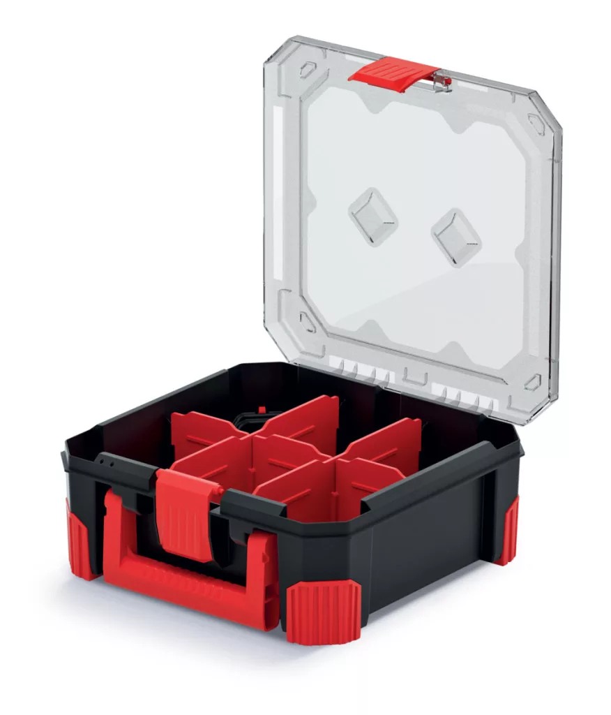 Kompakt és strapabíró szerszámrendező 5 kivehető rekesszel, átlátszó polikarbonát fedéllel és ergonomikus fogantyúval.