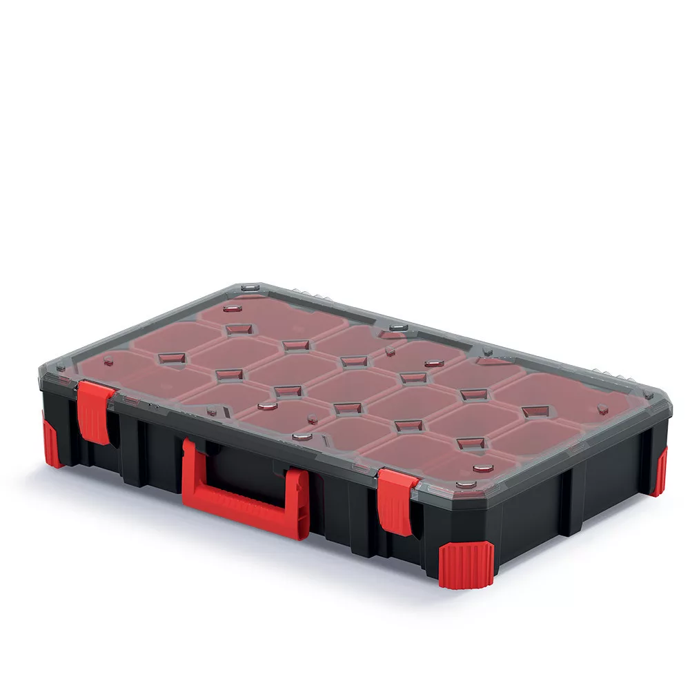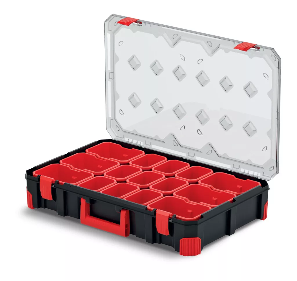 Professzionális szerszámrendező 15 kivehető tárolórekesszel, átlátszó polikarbonát fedéllel és megerősített polimer házzal, amely tökéletes megoldást nyújt a szerszámok és apró alkatrészek rendszerezett tárolására.