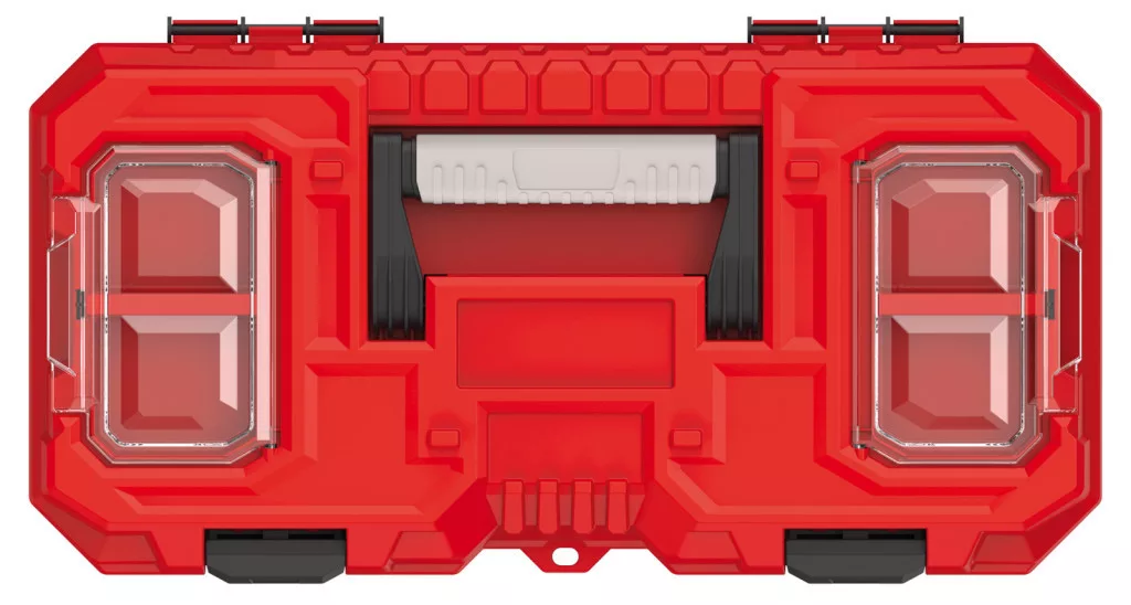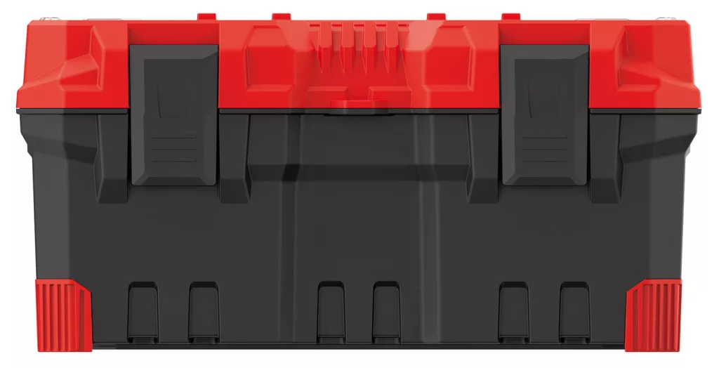 A Titan Plus 50 szerszámosláda ötvözi a robusztus kialakítást a praktikus funkcionalitással. A kettős anyagú ergonomikus fogantyú és a megerősített polimer ház maximális tartósságot biztosít, míg a fedélbe épített két átlátszó polikarbonát szervező tökéletes rendszerezést tesz lehetővé.