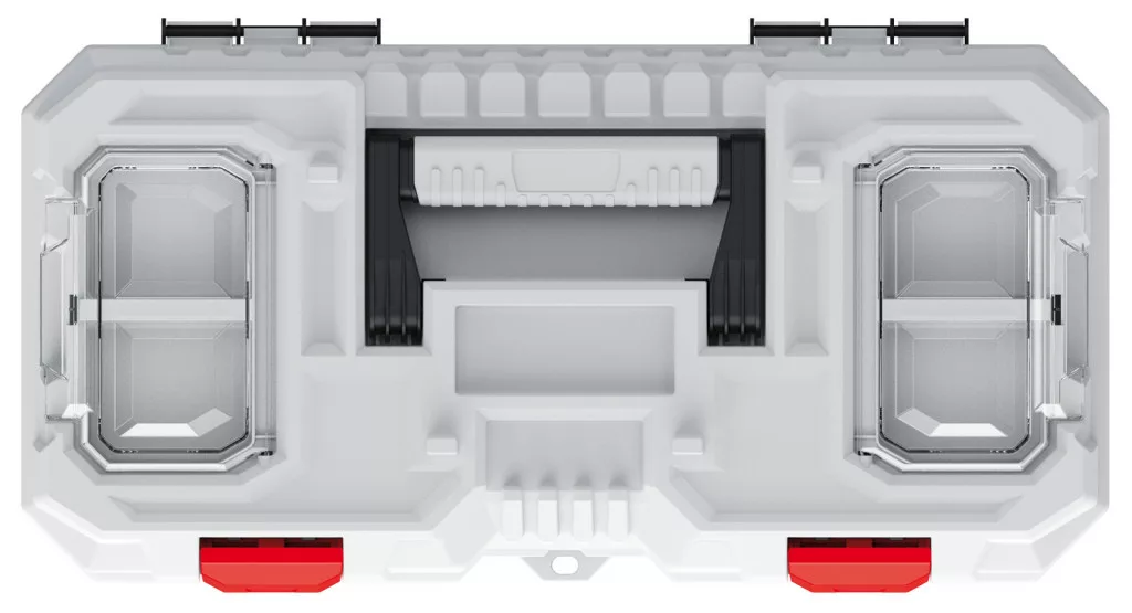 A polikarbonát fedéllel ellátott szervezők átláthatóvá teszik a tárolt eszközöket, az ergonomikus kétanyagú fogantyú pedig kényelmes szállítást biztosít. Az ABS csatok megbízható zárást garantálnak.