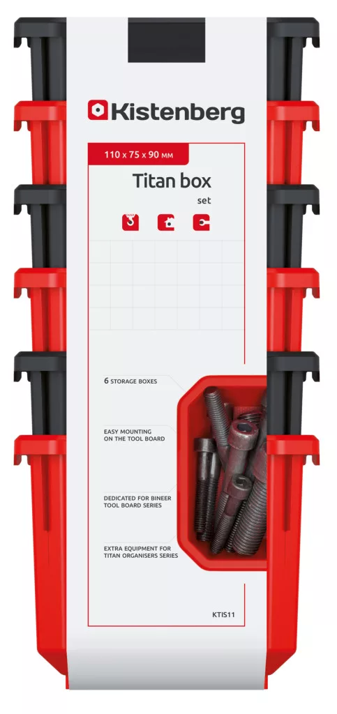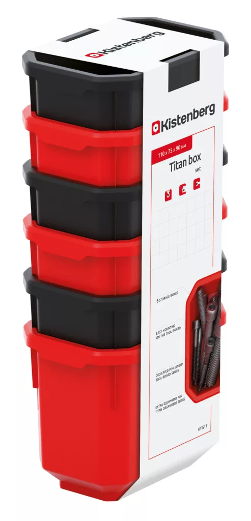 A Titan KTIS11 műhelytároló készlet forradalmasítja a műhelyben található apró alkatrészek és szerszámok tárolását. A hat különböző méretű tároló egység strapabíró polimerből készült, így ellenáll a mindennapi használat során fellépő igénybevételnek. A piros és fekete színkombináció nem csak esztétikus megjelenést biztosít, de segít a tartalom gyors azonosításában is.