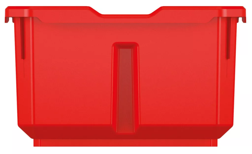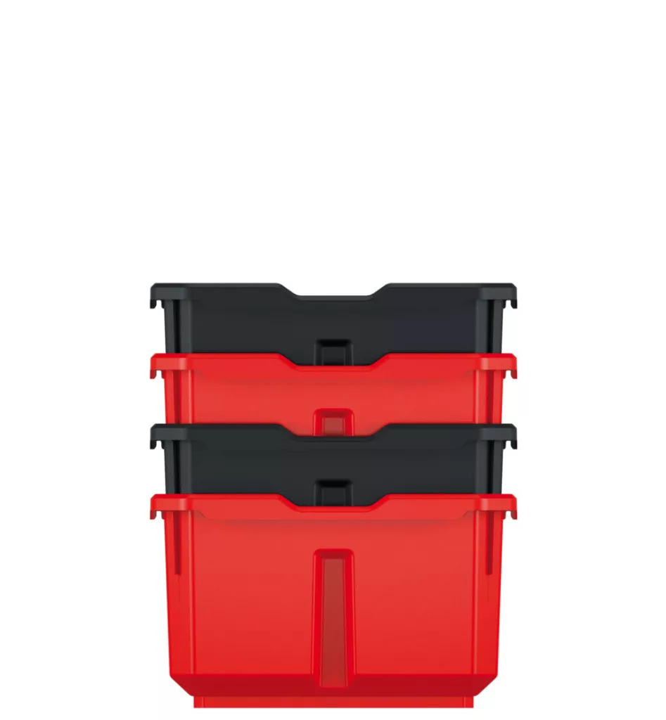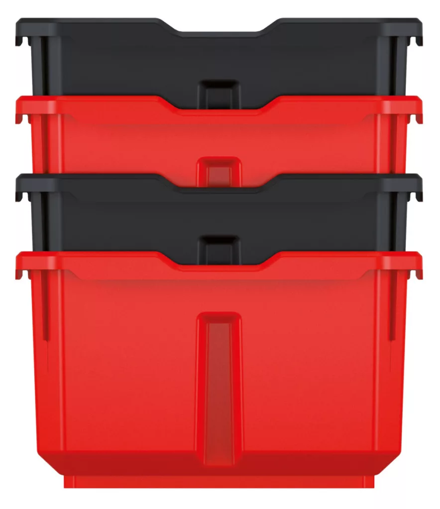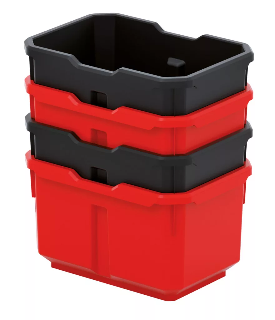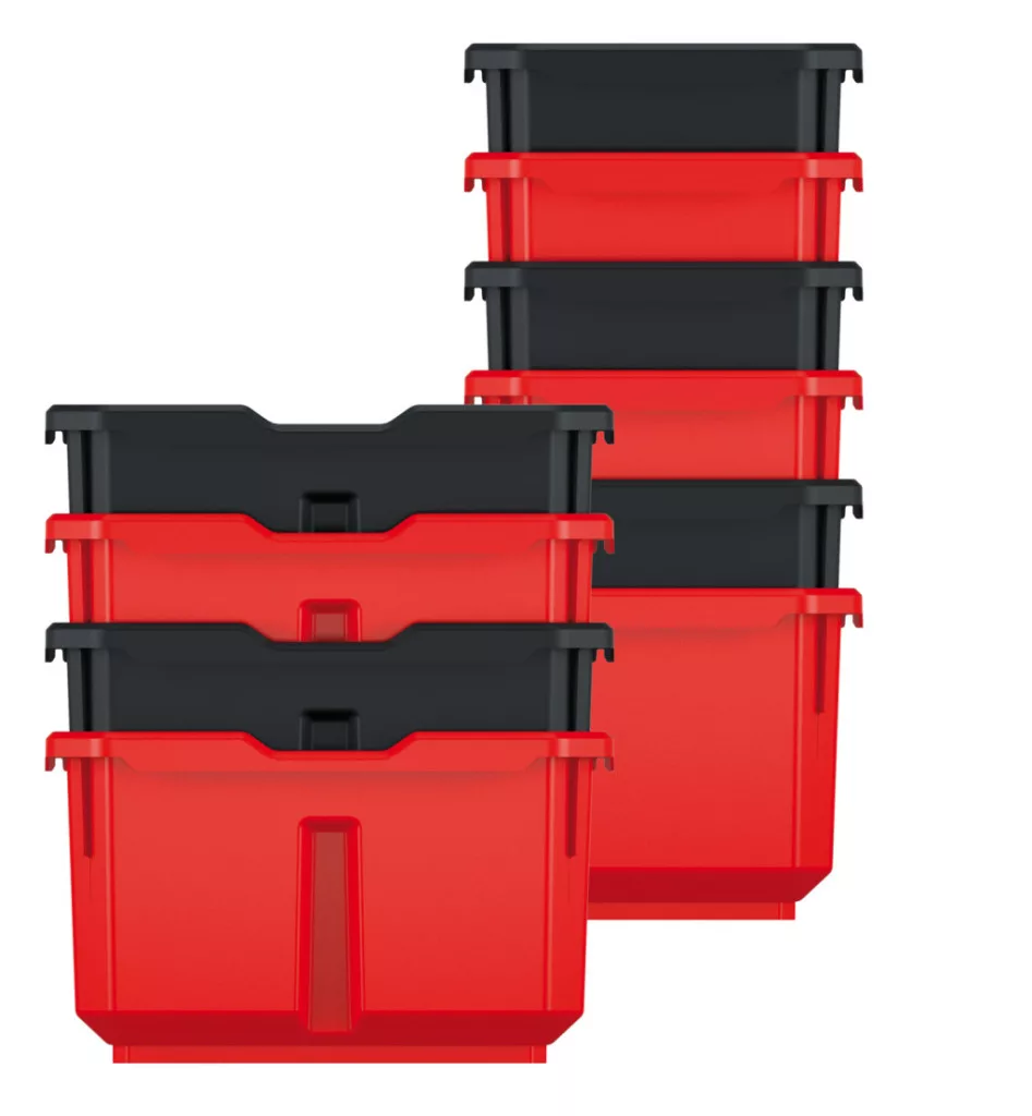 Az egyedi kialakítású dobozok egymásba illeszthetők és stabilak, így maximális helykihasználást biztosítanak. A piros-fekete színkombináció nem csak esztétikus, de segíti a vizuális rendszerezést is.