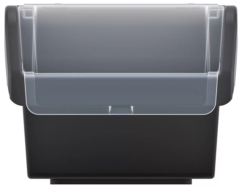 Professzionális műhelyfiók átlátszó polipropilén fedéllel, amely tökéletes alkatrészek és szerszámok rendszerezett tárolására.