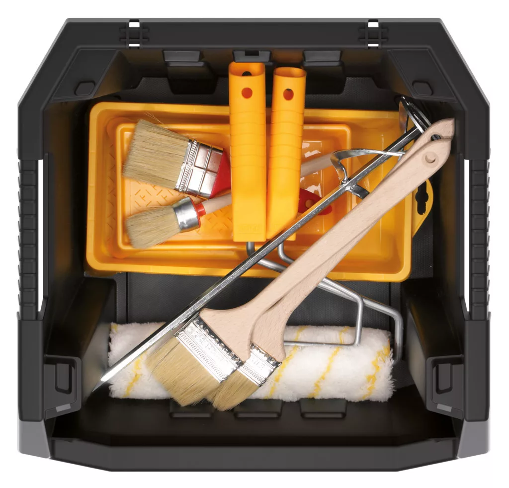 Strapabíró, nagy teherbírású műhelydoboz két praktikus fogantyúval és rakásolási lehetőséggel, ideális szerszámok és alkatrészek tárolására.