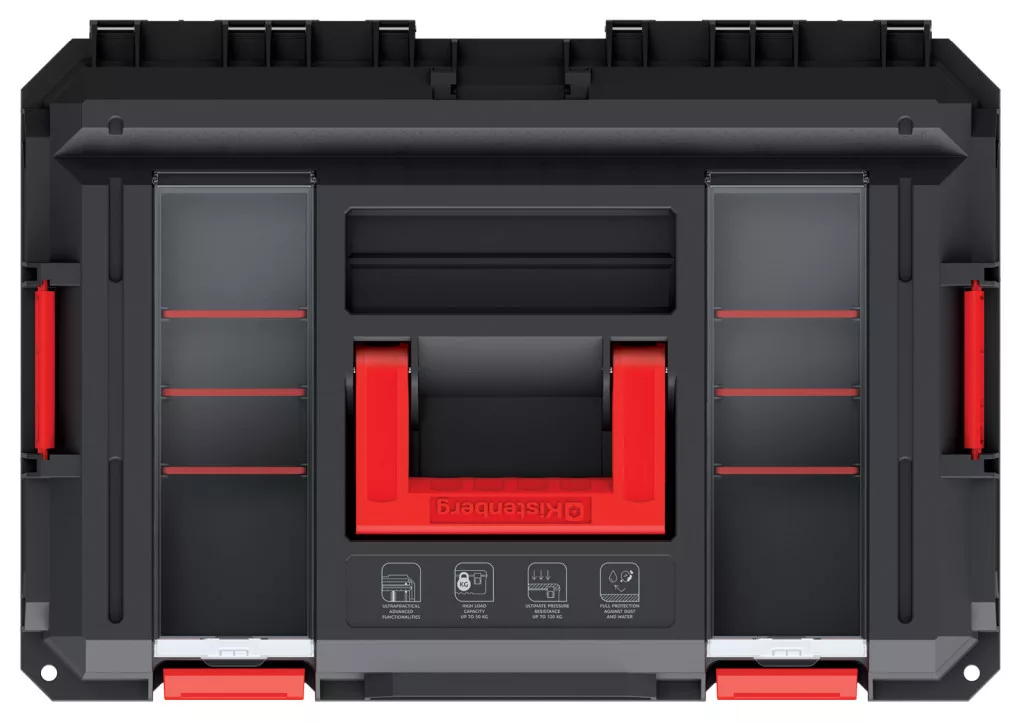 A láda belső tere rendkívül rugalmasan alakítható a kivehető elválasztókkal és tárolórekeszekkel. A fedélben található két szervező egység és a belső szerszámtartó maximális rendezettséget biztosít. Különlegessége, hogy munkaállványként is használható, akár 120 kg terhelhetőséggel.