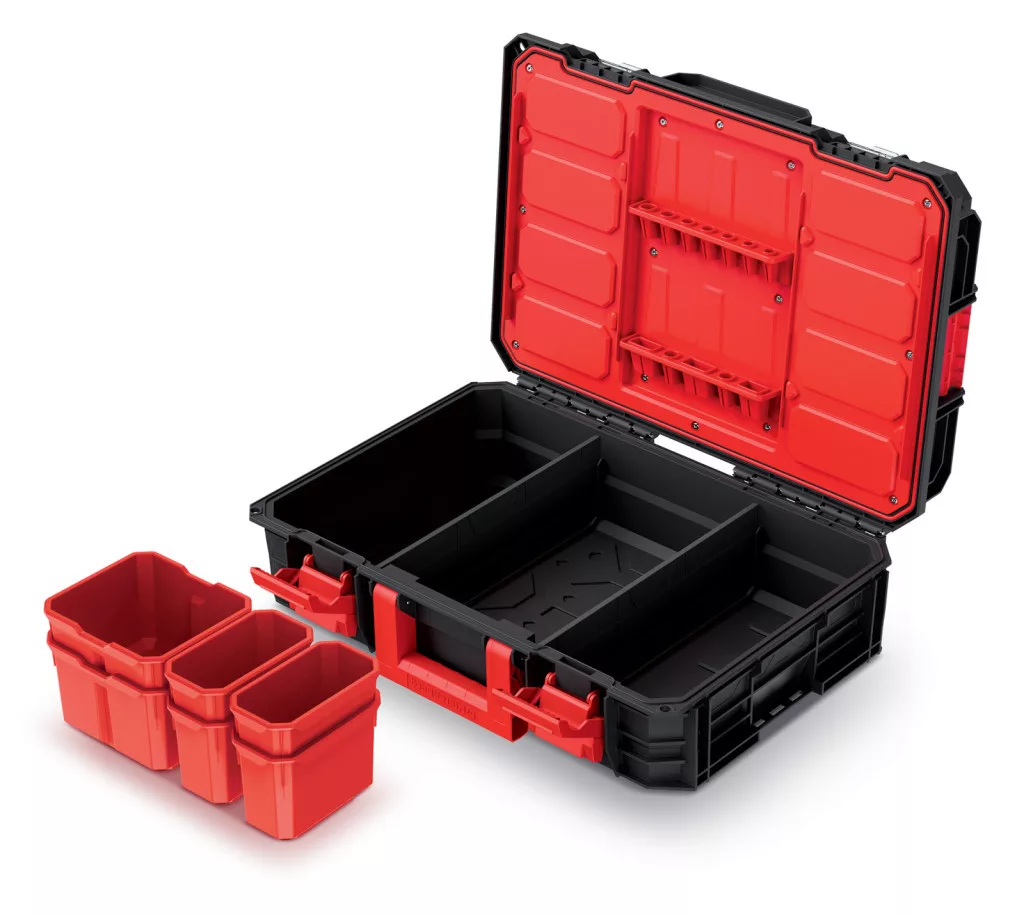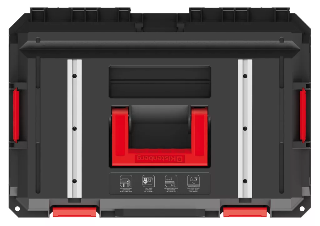 Ez a modern szerszámkoffer egyesíti a robusztus kialakítást a praktikus funkcionalitással. A megerősített polimer házszerkezet és az IP55 védelem megbízható védelmet nyújt a szerszámoknak por és nedvesség ellen. A beépített alumínium sínek, valamint a 6 kivehető tárolórekesz maximális szervezhetőséget biztosít.