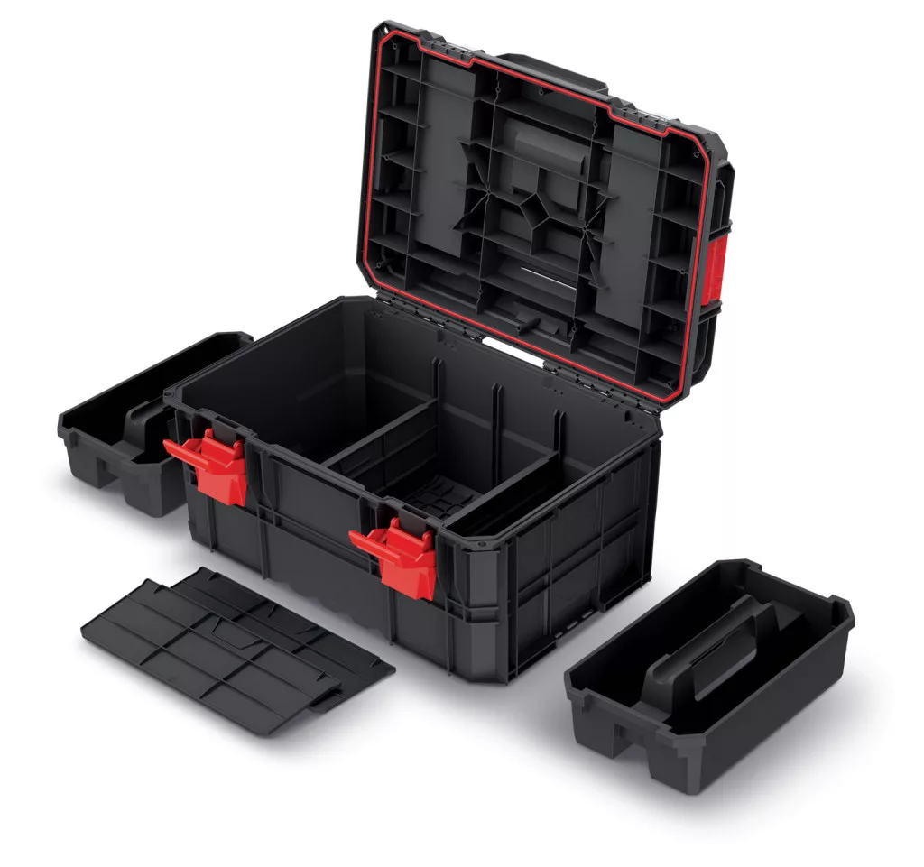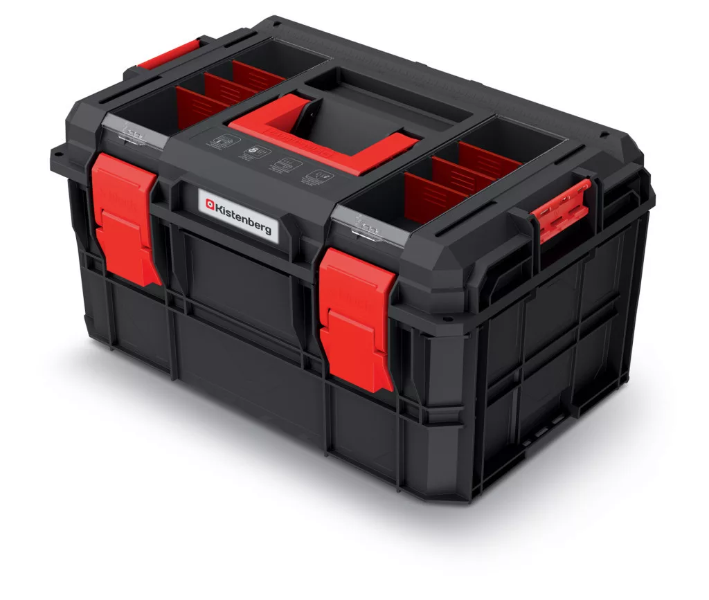 Professzionális, moduláris szerszámosláda beépített szervezőkkel és IP55 védelemmel, amely tökéletes megoldást nyújt a szerszámok rendszerezett tárolására és szállítására.