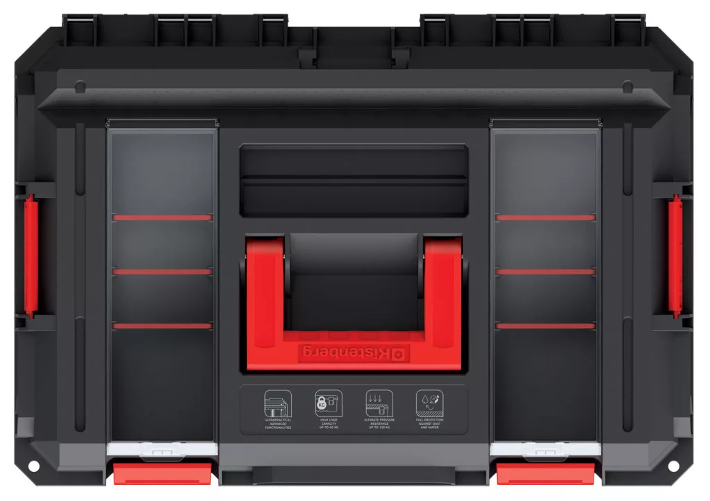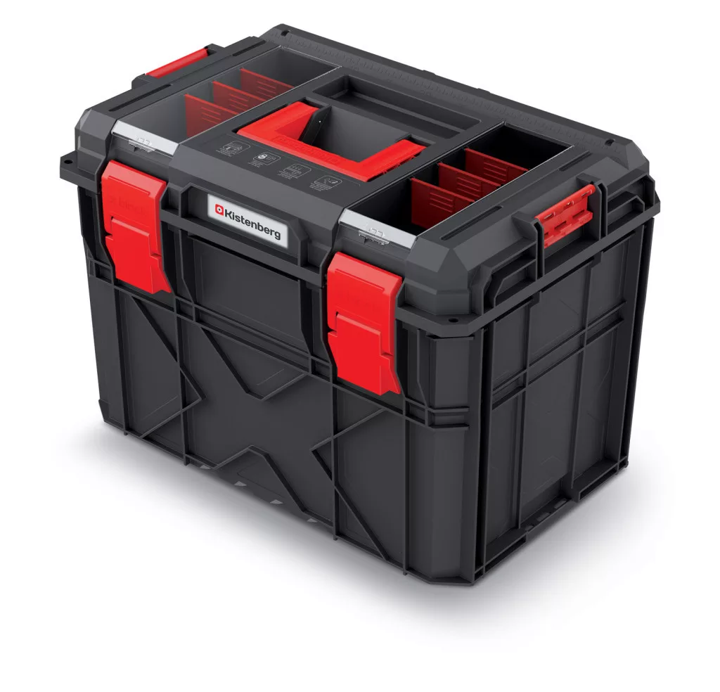 Moduláris, vízálló szerszámosláda beépített szervezőkkel és 50 kg teherbírással, ami tökéletes választás professzionális felhasználásra.