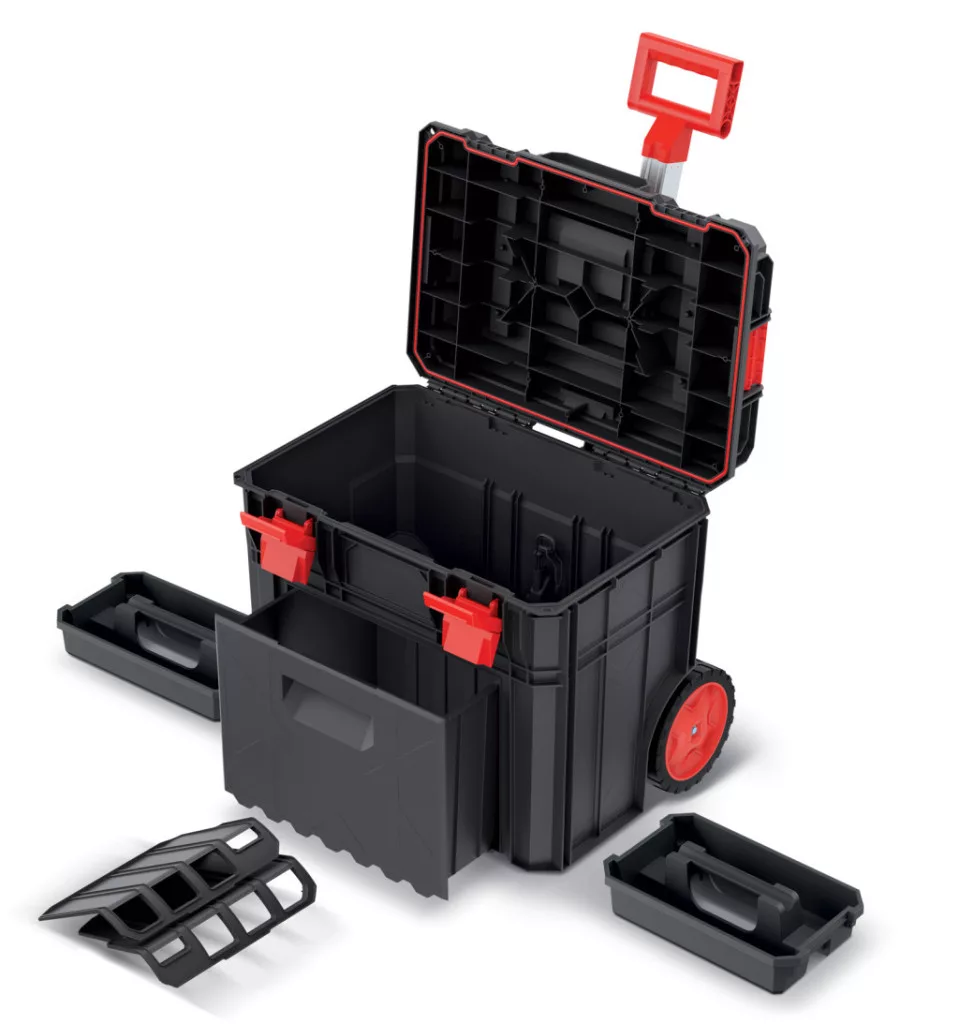 Ez a prémium minőségű gurulós szerszámosláda egyesíti a mobilitást és a praktikusságot. A megerősített polimer háznak és a robusztus kerekeknek köszönhetően könnyedén szállíthatja nehéz szerszámait a munkaterületen. A beépített fiók gyors hozzáférést biztosít a gyakran használt eszközökhöz a fedél felnyitása nélkül.