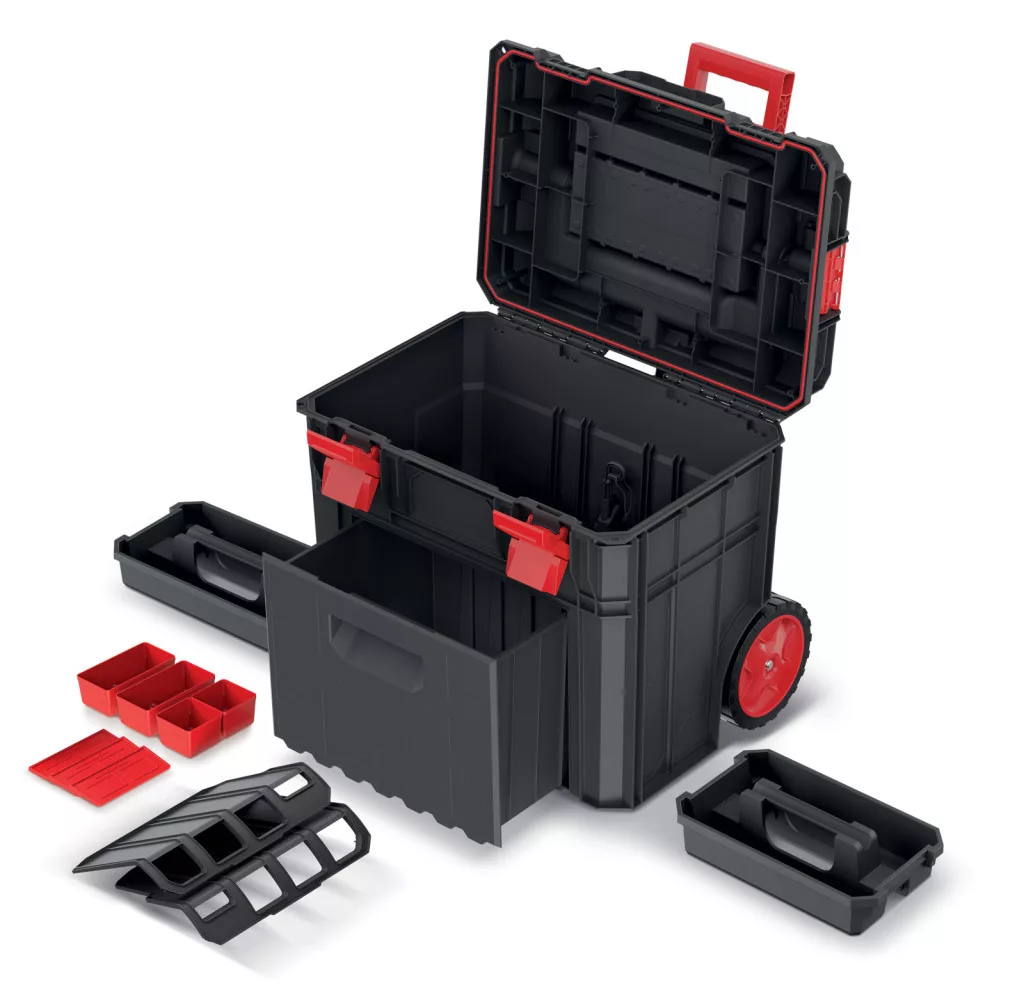 Professzionális, kerekes szerszámosláda beépített fiókkal és szervezőrendszerrel, amely akár 50 kg terhelhetőséggel és por- és vízálló kialakítással rendelkezik.