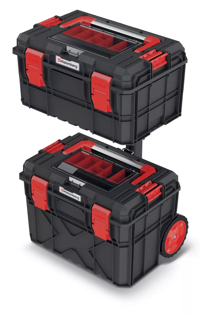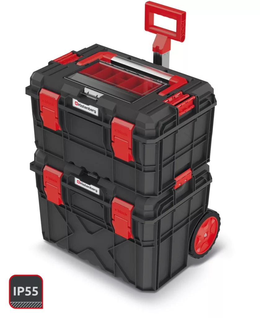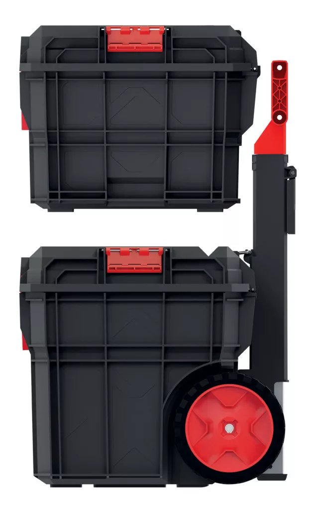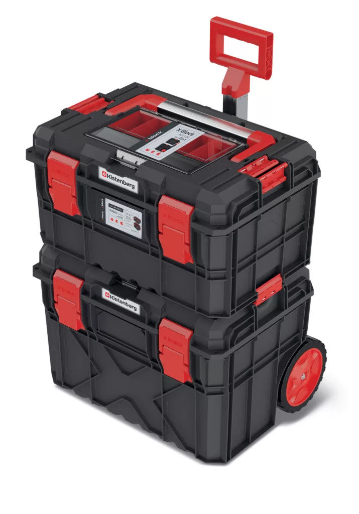 Professzionális, kétrészes moduláris szerszámosláda szett teleszkópos fogantyúval és kerekekkel, por- és vízálló kivitelben. Ideális megoldás szerszámok biztonságos tárolására és szállítására.