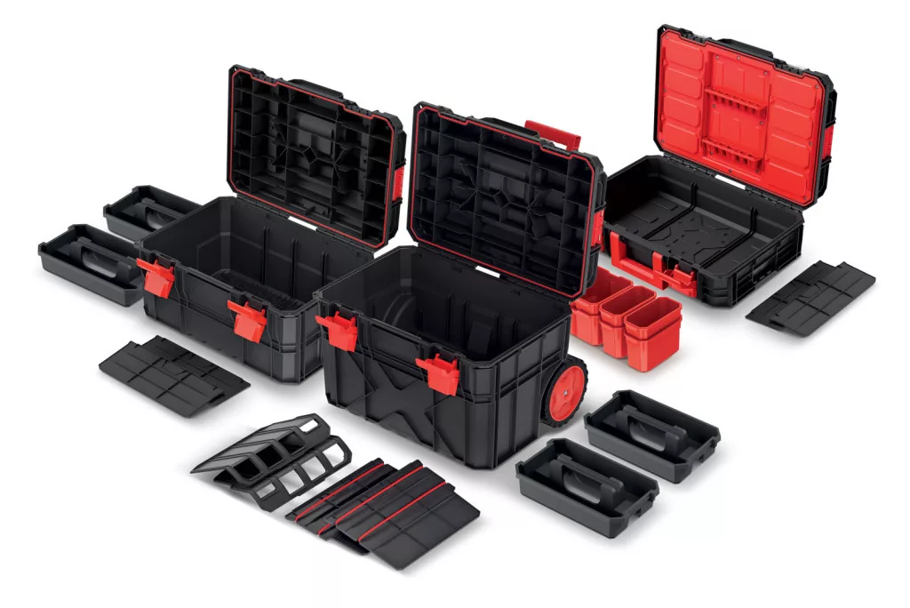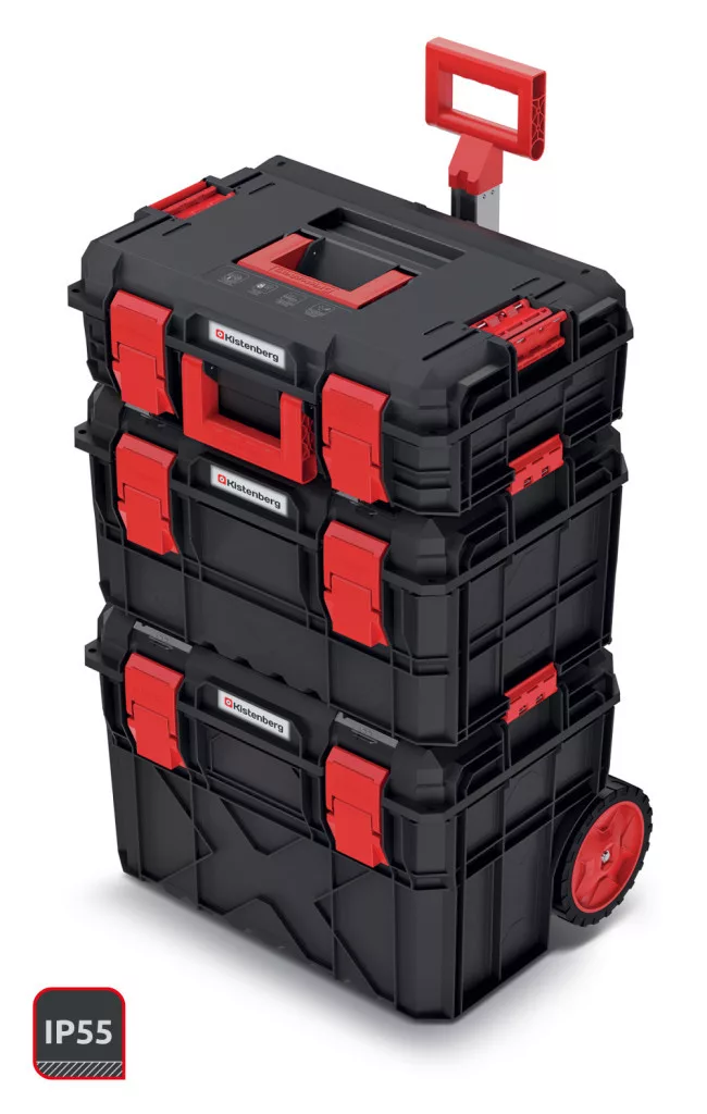 A szerszámosládák ütésálló polimerből készültek, IP55 védettséggel rendelkeznek a por és nedvesség ellen. A praktikus belső rendszerezők, hordozófogantyúk és a beépített mérőszalag mind a professzionális használatot szolgálják.