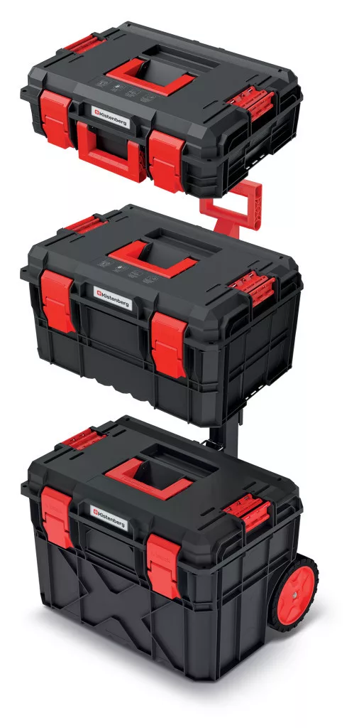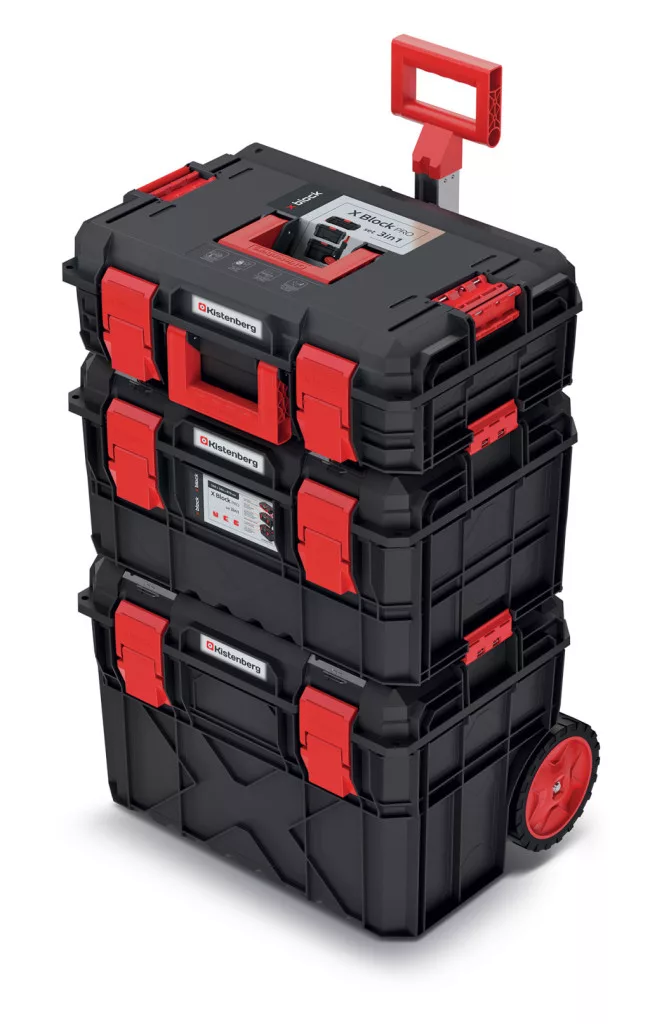 Ez a prémium minőségű szerszámosláda szett három különböző méretű tárolóegységből áll, amelyek tökéletesen illeszkednek egymáshoz. A rendszer alapját egy gurulós alapegység képezi teleszkópos fogantyúval, amelyre további két kisebb méretű tárolódoboz rögzíthető biztonságosan.