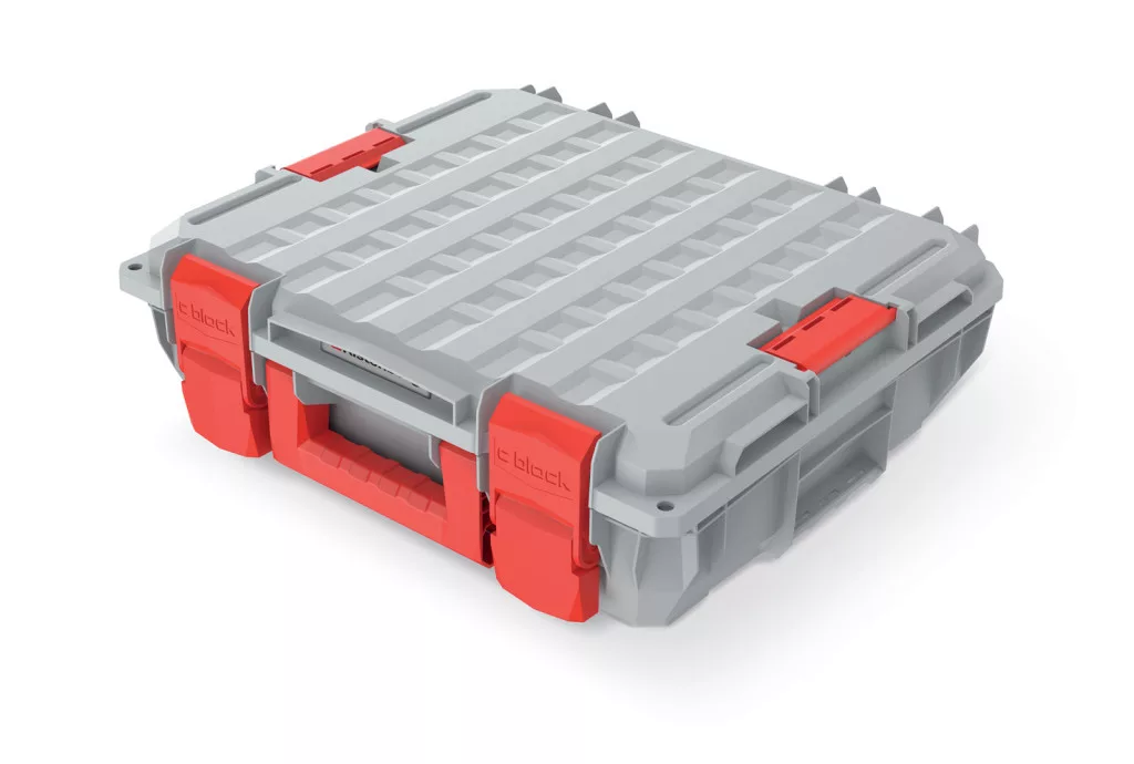 Prémium minőségű, limitált kiadású szerszámkoffer megnövelt teherbírással és por- és vízálló kialakítással, egyedi hűvösszürke-piros színkombinációban.