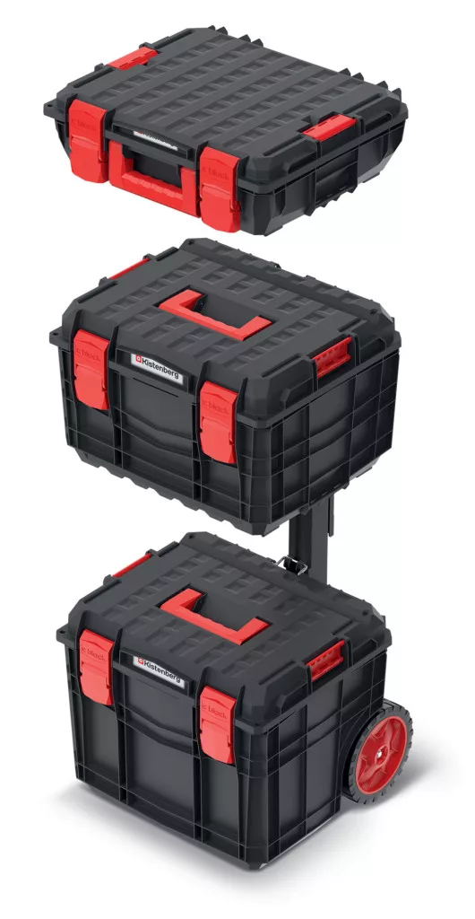 Professzionális, moduláris szerszámtároló rendszer három különböző méretű ládával, beépített kerekekkel és teleszkópos fogantyúval a maximális mobilitásért.