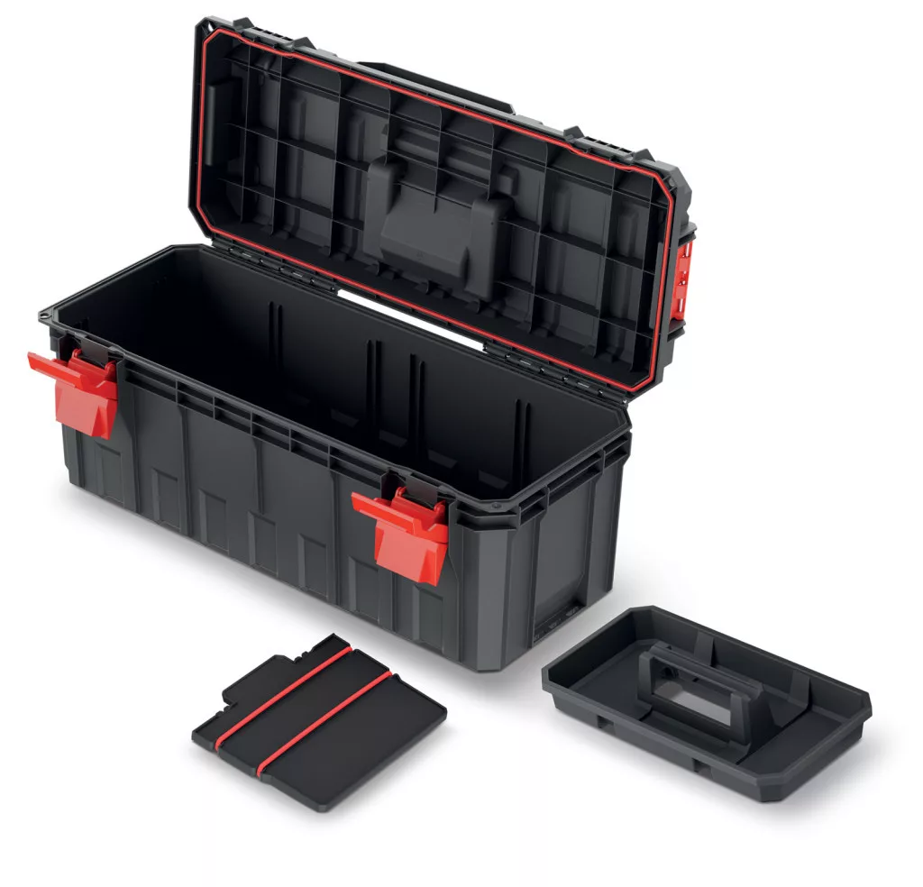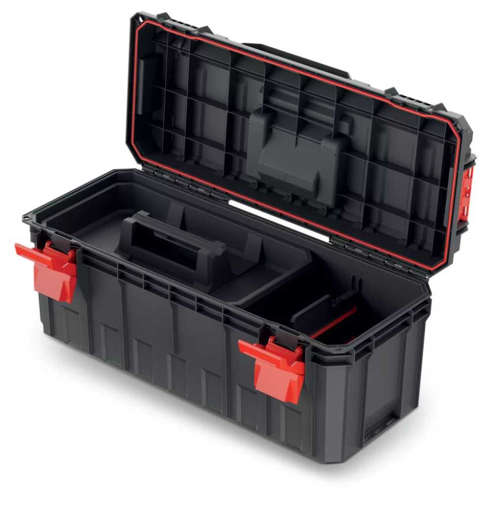 Strapabíró, IP55 védettségű professzionális szerszámosláda beépített mérőszalaggal és 100 kg teherbírású munkafelülettel.
