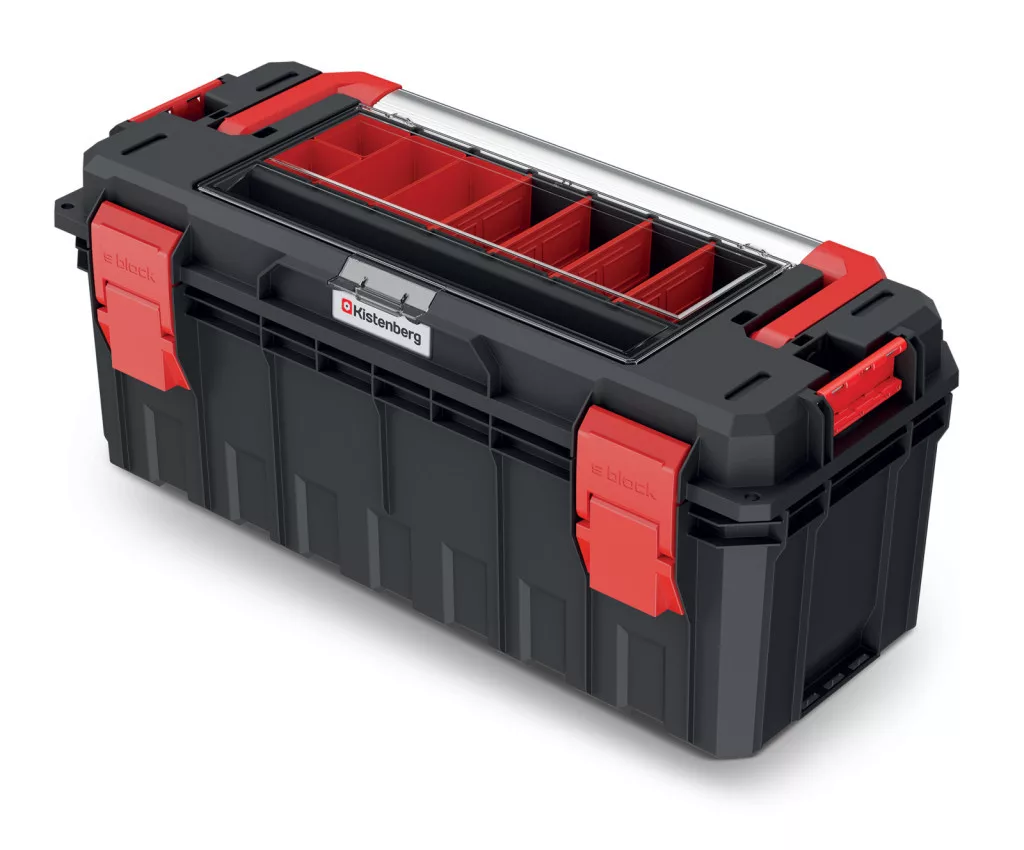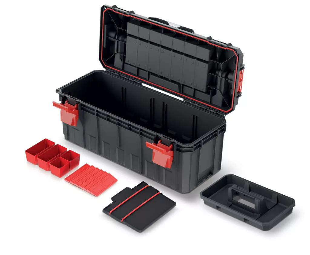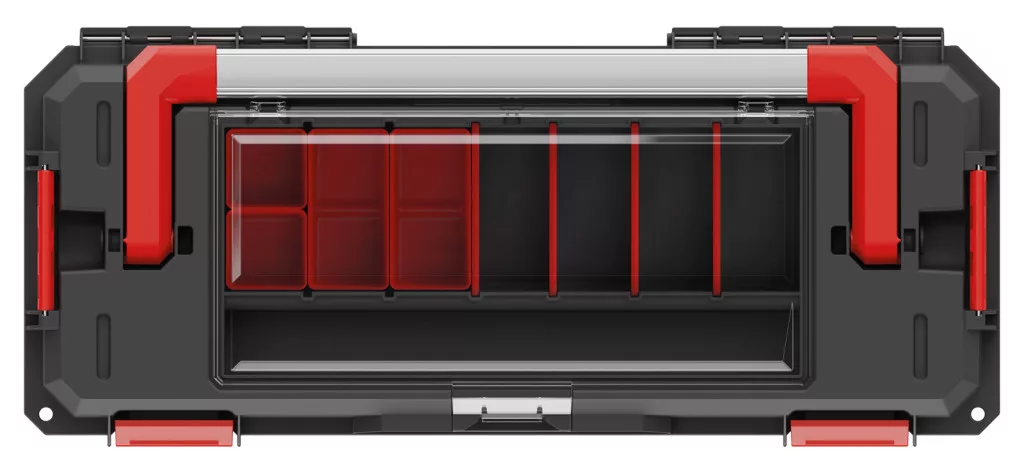 Prémium minőségű, moduláris szerszámosláda alumínium fogantyúval és beépített rendszerezővel, amely tökéletes védelmet nyújt a szerszámoknak por és nedvesség ellen.