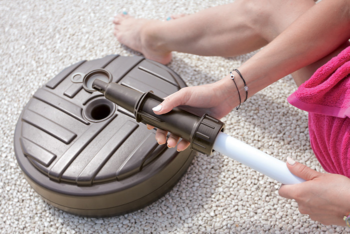 Stabil és megbízható napernyőtalp homokkal vagy vízzel tölthető kialakítással, 39 cm átmérővel, amely tökéletes megoldást nyújt a kerti napernyők biztonságos rögzítéséhez.