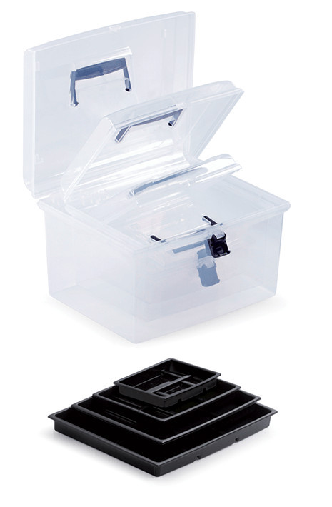 A doboz tetején található praktikus fogantyú könnyű hordozhatóságot biztosít, a biztonságos záródást pedig egy megbízható csatos rögzítő rendszer garantálja. Az átgondolt kialakítás lehetővé teszi a dobozok egymásra helyezését, így helytakarékos tárolást tesz lehetővé.