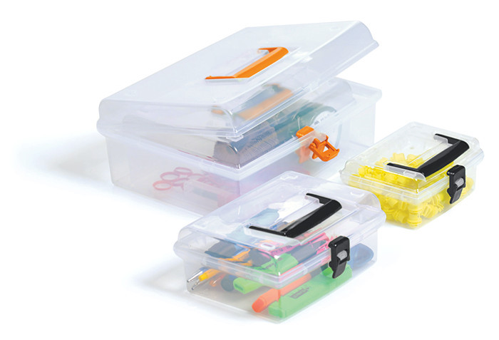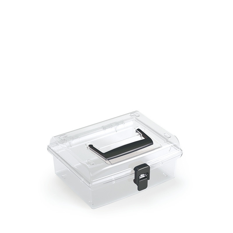 Praktikus, átlátszó műanyag rendszerező doboz fekete fogantyúval, amely tökéletes megoldást nyújt kisebb tárgyak rendezett tárolására.
