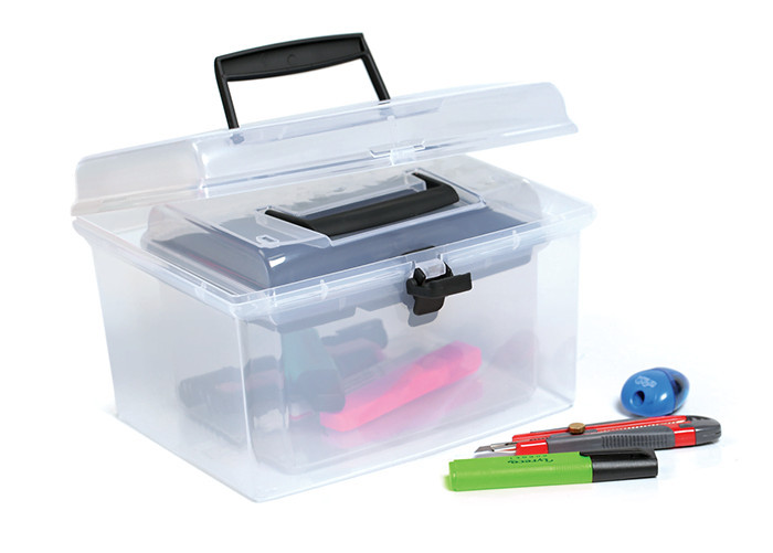 A doboz tetején található praktikus fogantyú könnyű hordozhatóságot biztosít, a biztonságos záródást pedig egy megbízható csatos rendszer garantálja. A moduláris kialakítás lehetővé teszi több doboz hatékony egymásra helyezését.