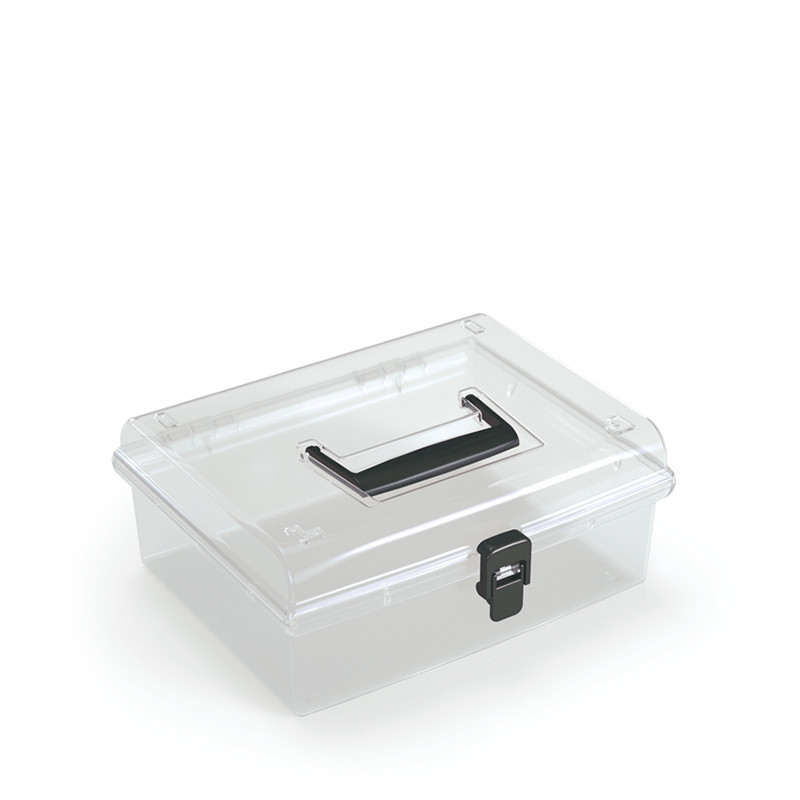 Praktikus, átlátszó műanyag tárolódoboz fekete fogantyúval és pattintós zárral, ideális irodai és otthoni rendszerezéshez.