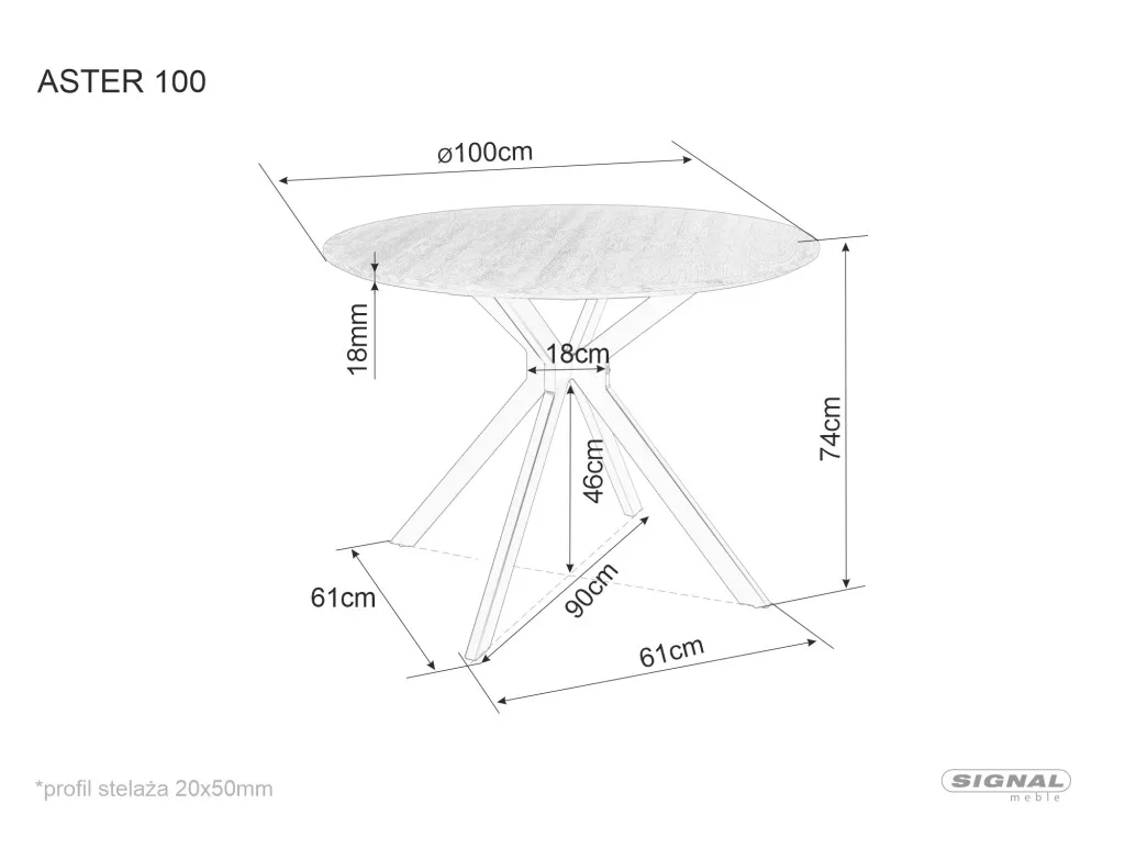 Az Aster étkezőasztal tökéletes választás a modern otthonokba. A 100 cm átmérőjű kerek asztallap tölgy színű MDF-ből készült, kiváló minőségű furnér borítással. A matt fekete fémlábak egyedi, pókszerű kialakítása nem csak stabil alapot biztosít, de szemet gyönyörködtető látványt is nyújt. Az asztal 76 cm magas, így kényelmes étkezést biztosít akár 6 személy részére is.