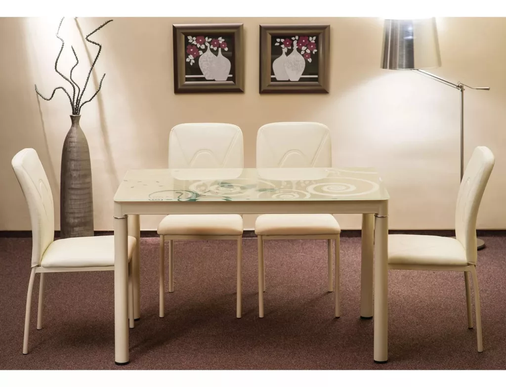 Modern, elegáns étkezőasztal edzett üveg asztallappal és krém színű fém vázzal. Tökéletes választás 4 személy számára, maximális terhelhetősége 100 kg.