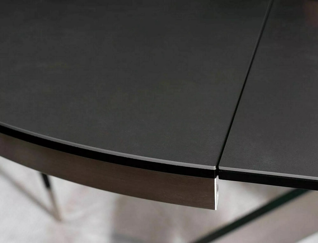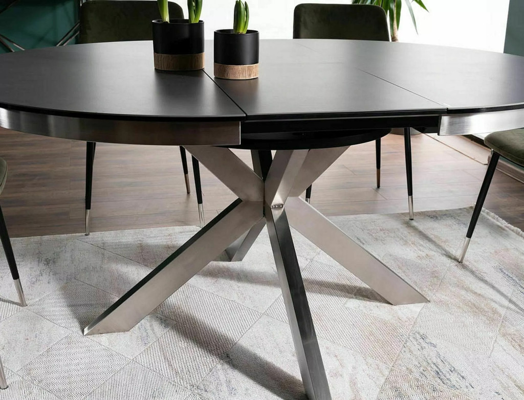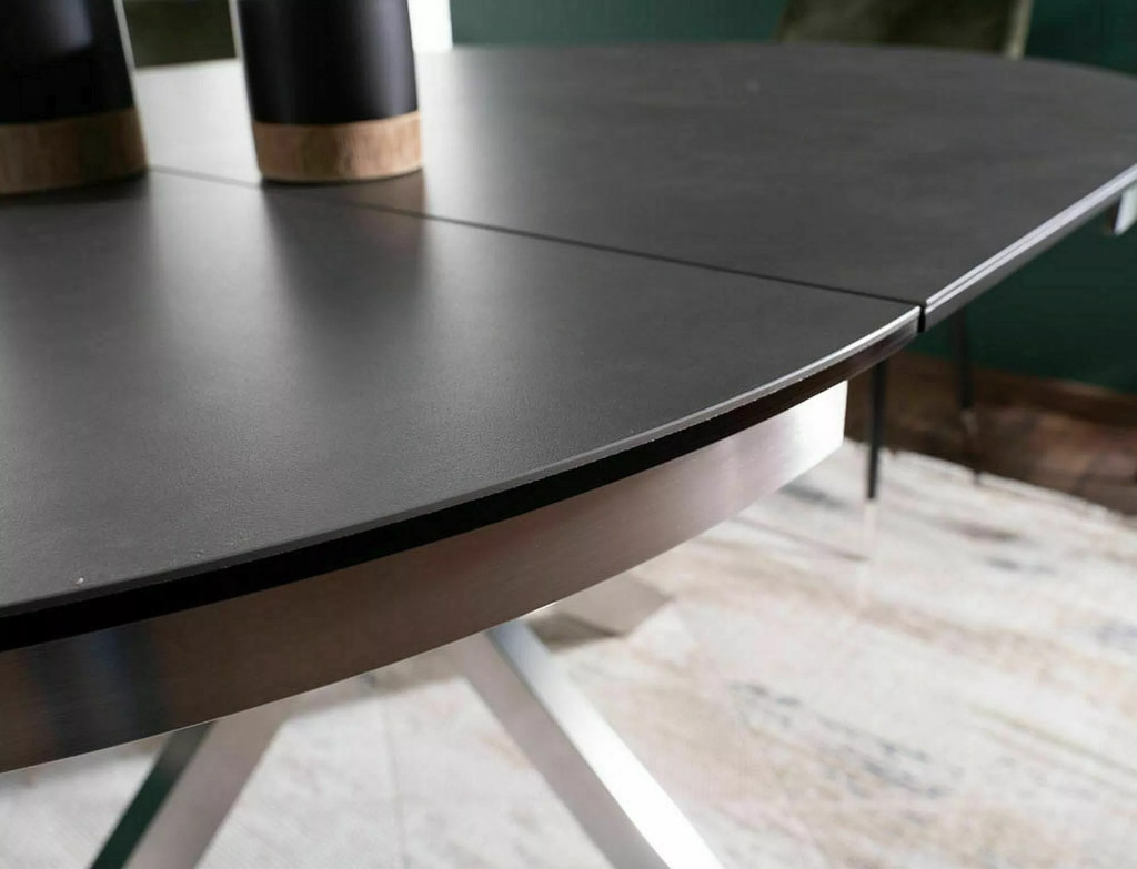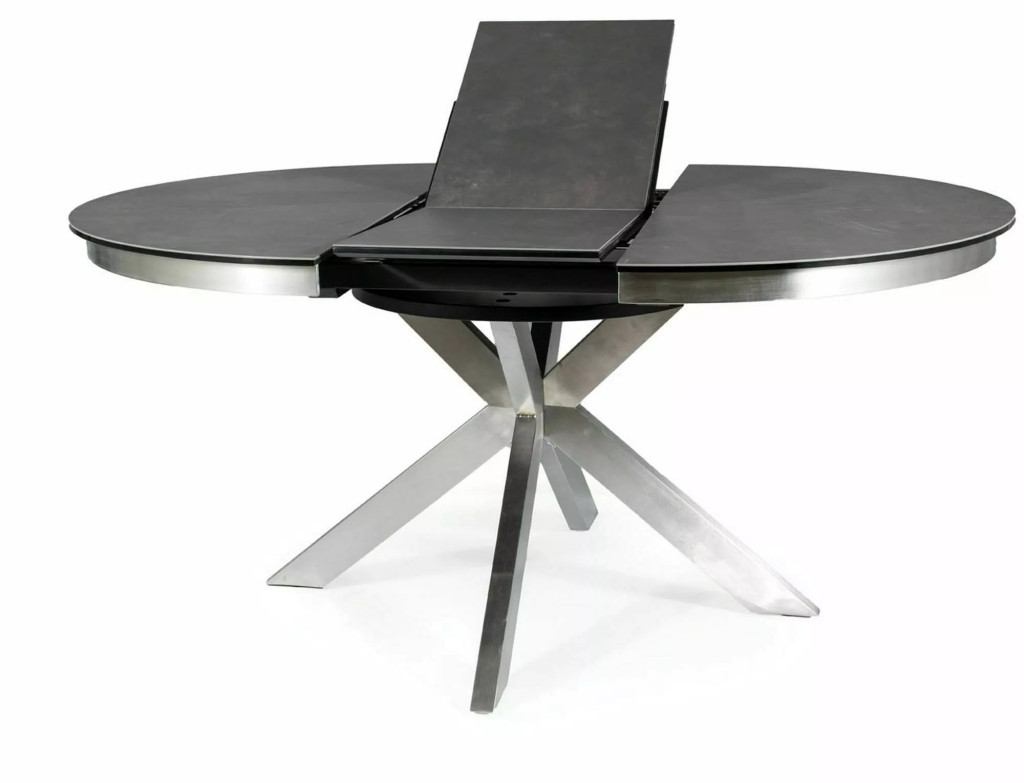 Modern, bővíthető étkezőasztal edzett üveg és spanyol kerámia asztallappal, valamint szálcsiszolt rozsdamentes acél lábszerkezettel. A 120 cm-ről 160 cm-re bővíthető kerek asztallap tökéletes megoldást nyújt akár 8 fő kényelmes étkezéséhez.