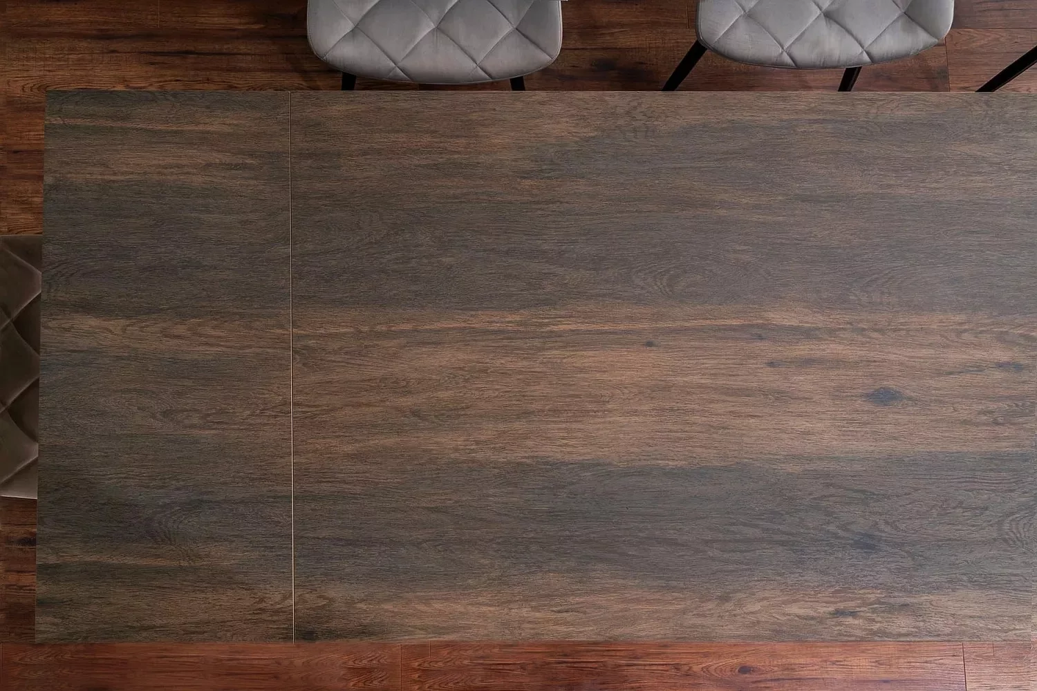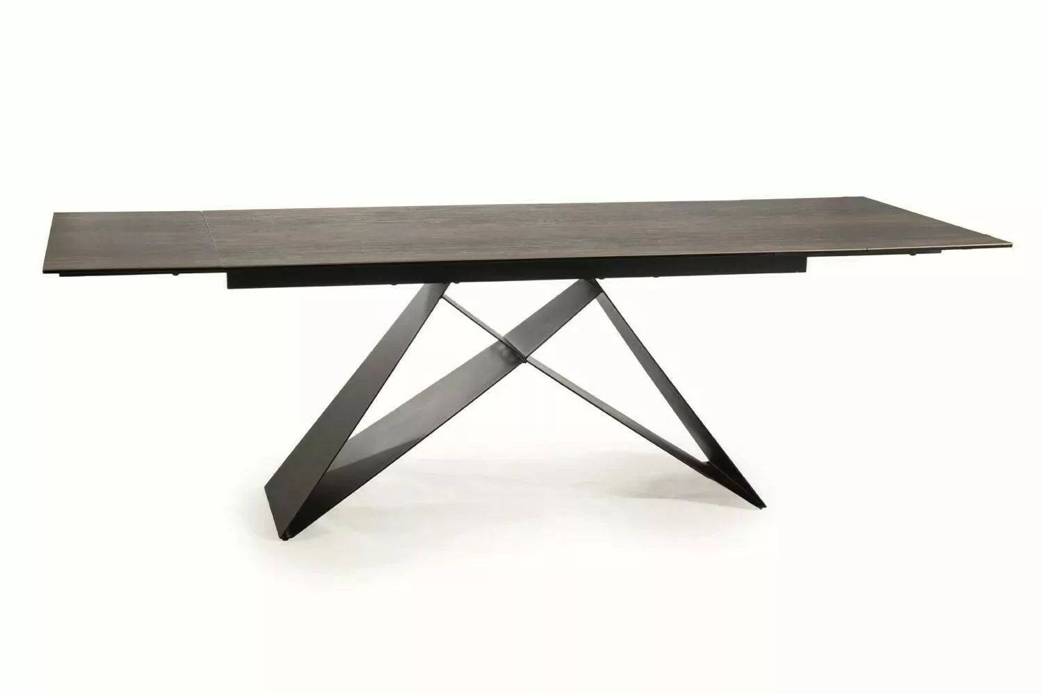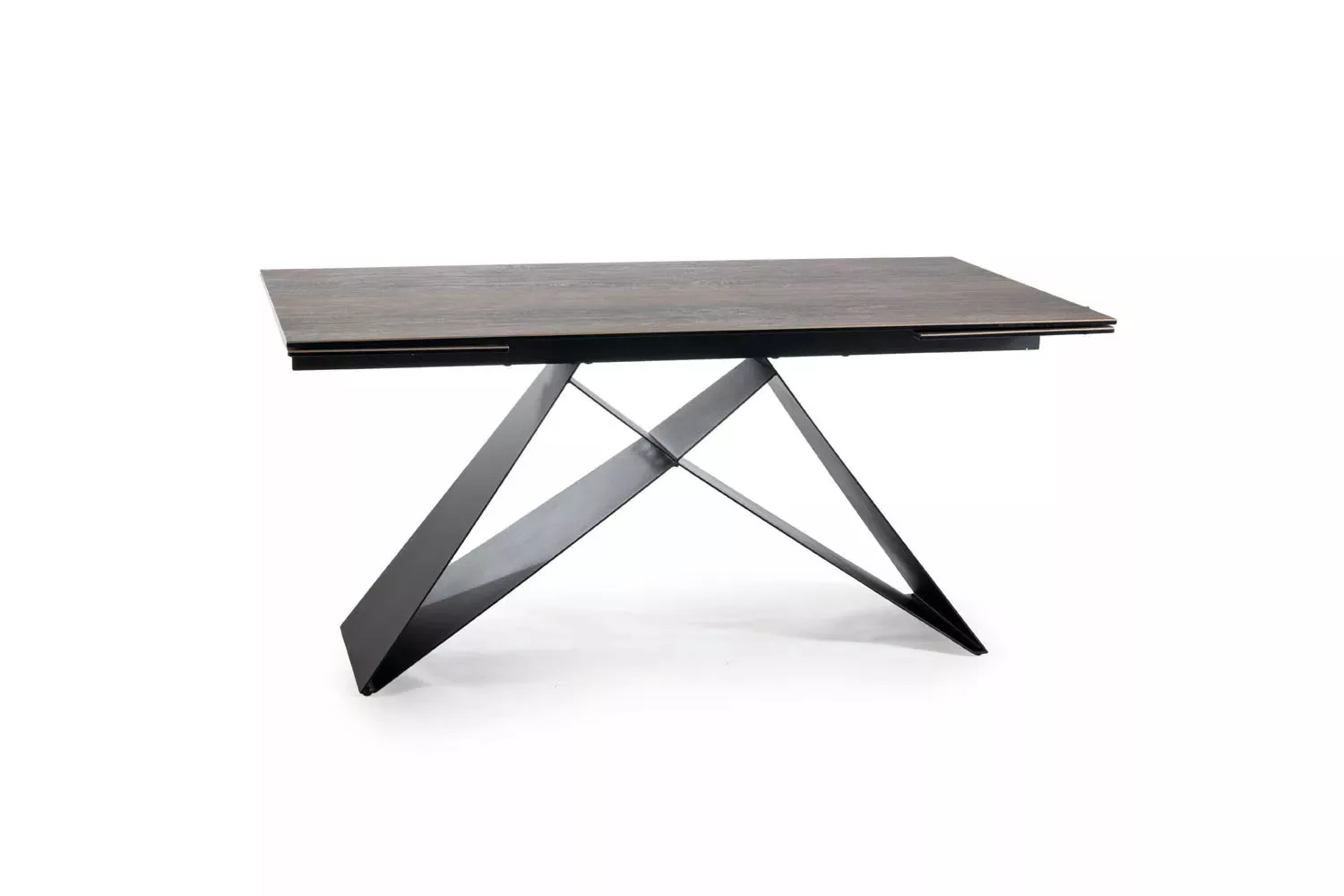 Modern, bővíthető étkezőasztal spanyol Legno kerámia asztallappal és edzett üveggel, amely elegáns fa hatású barna színével és matt fekete fém vázszerkezetével tökéletes választás akár 12 fő számára is.