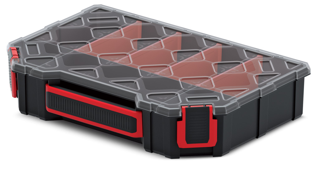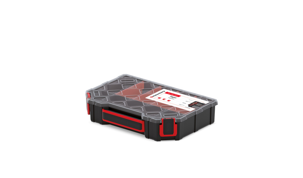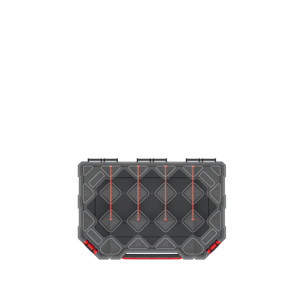 Kompakt, alacsony profilú szerszámrendező átlátszó fedéllel és 4 kivehető rekesszel a hatékony szerszámtároláshoz.