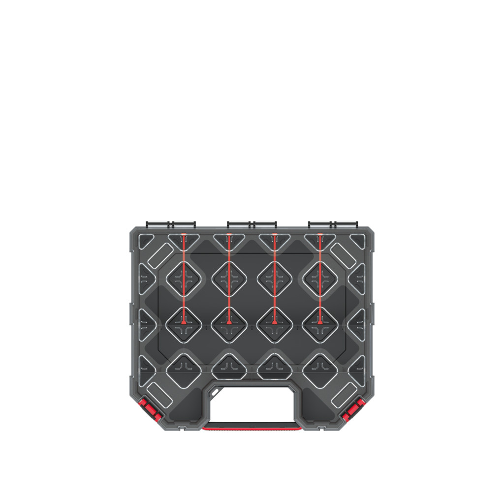 A 4 kivehető elválasztóval testre szabható belső tér lehetővé teszi a szerszámok rendszerezett tárolását. A robusztus záróelemek megbízhatóan tartják a fedelet, így a tartalom biztonságban van szállítás közben is.