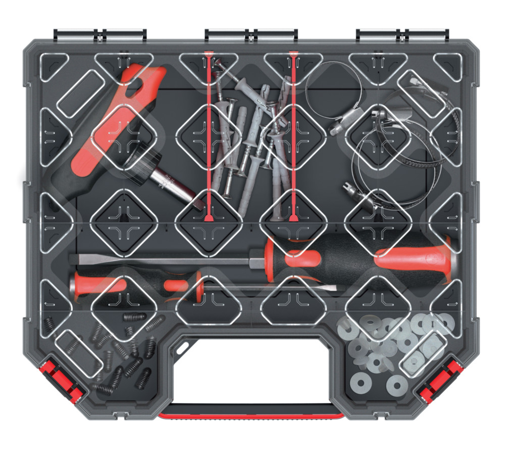 Professzionális szerszámrendező átlátszó fedéllel és 4 kivehető elválasztóval, megerősített polimer házban.