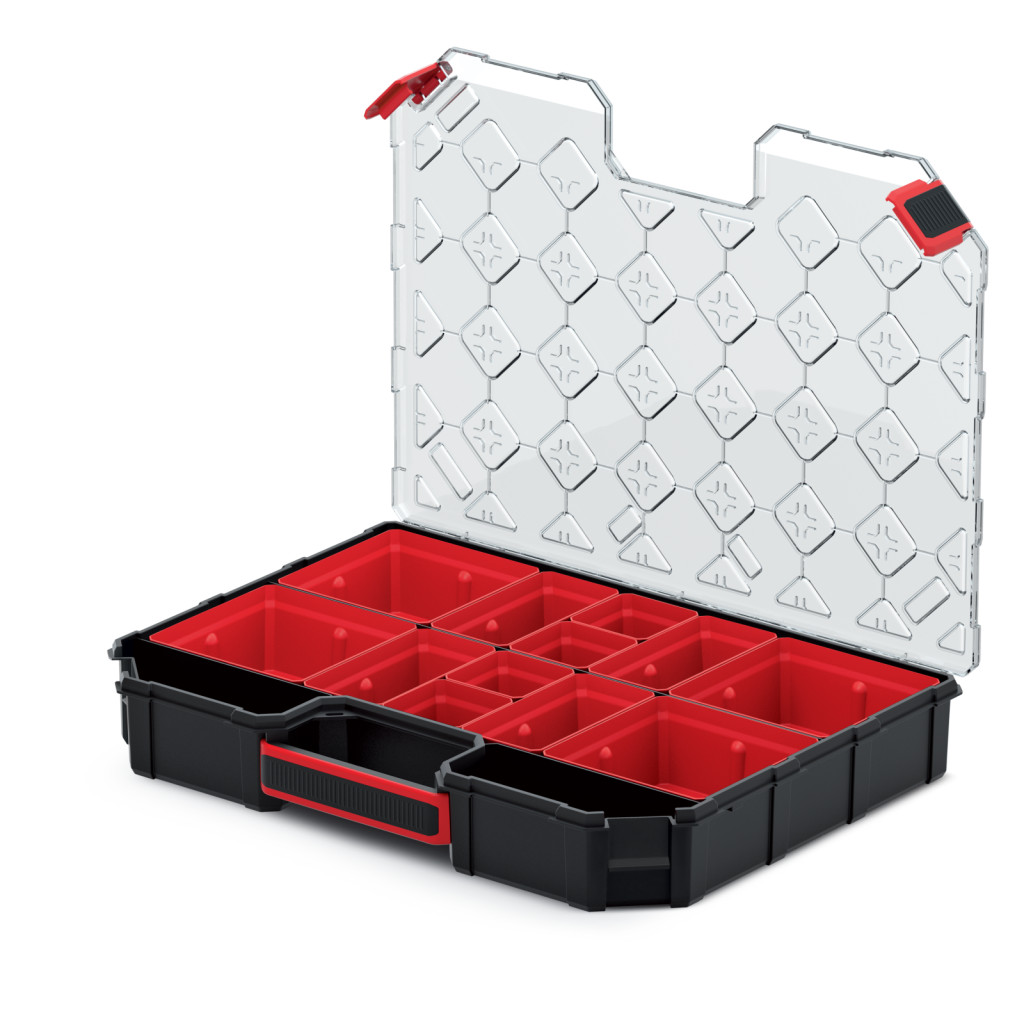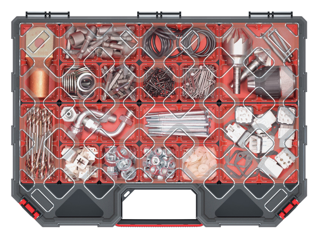 Kompakt és strapabíró szerszámrendező 12 kivehető tárolórekesszel, átlátszó polikarbonát fedéllel és ergonomikus fogantyúval.
