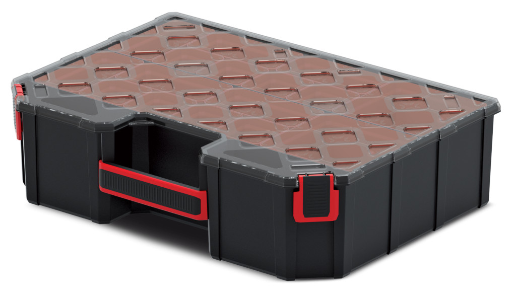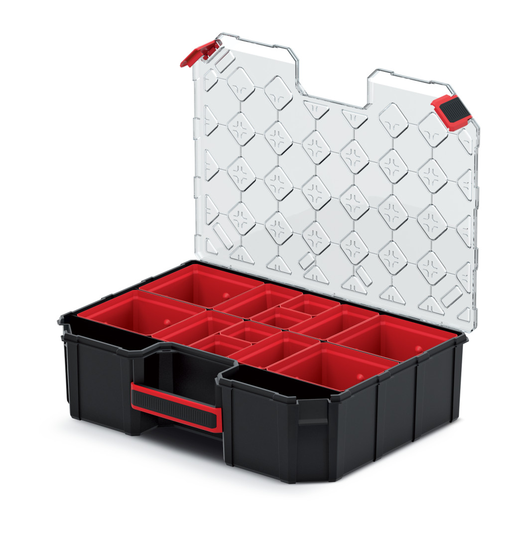 Professzionális szerszámrendező 12 kivehető tárolórekesszel, átlátszó polikarbonát fedéllel és ergonomikus fogantyúval.