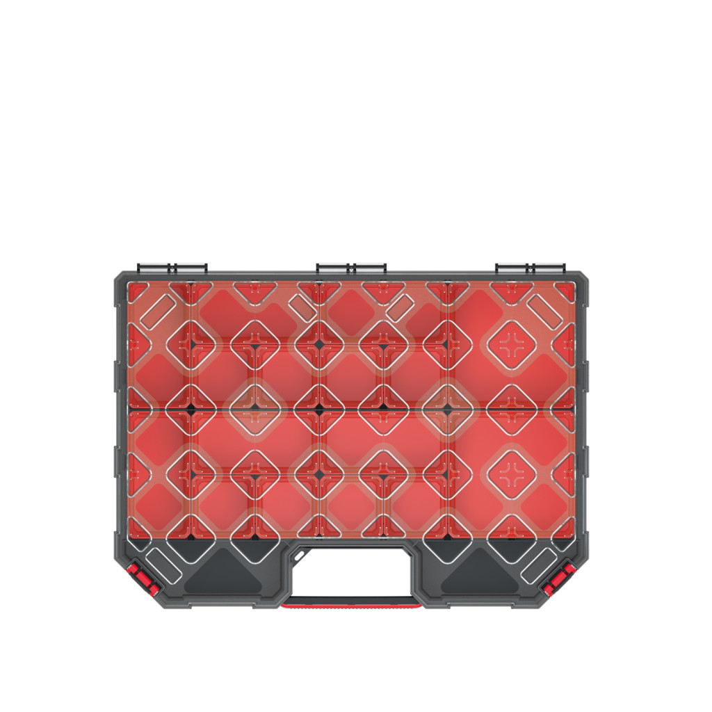 A 12 kivehető tárolórekesz lehetővé teszi a belső tér rugalmas kialakítását, míg az ergonomikus fogantyú és a megbízható zárórendszer könnyű szállíthatóságot garantál. A fekete-piros színkombináció nem csak stílusos megjelenést, de professzionális kisugárzást is kölcsönöz.