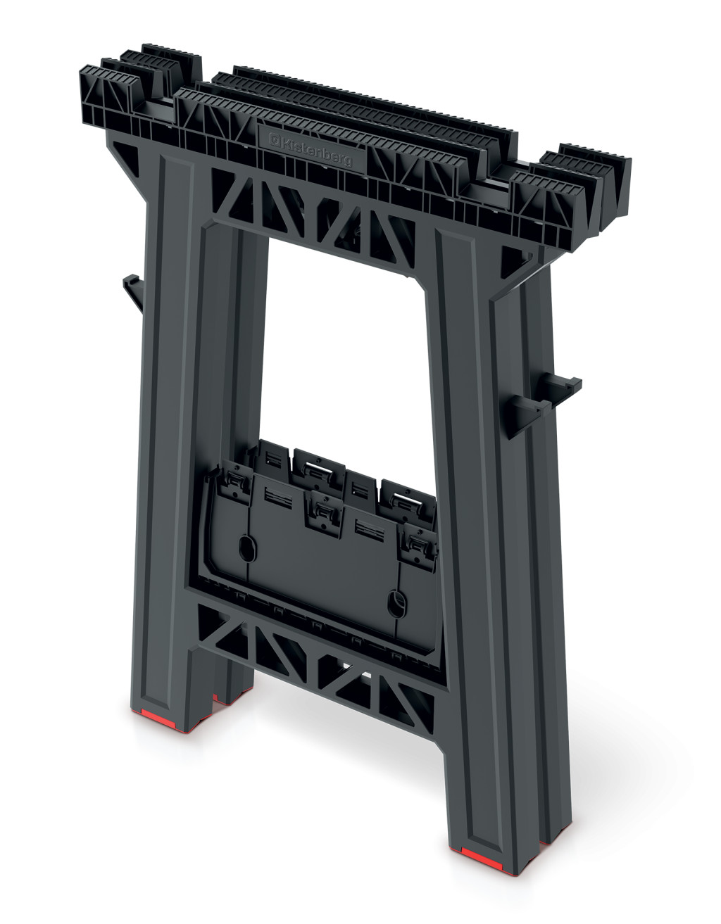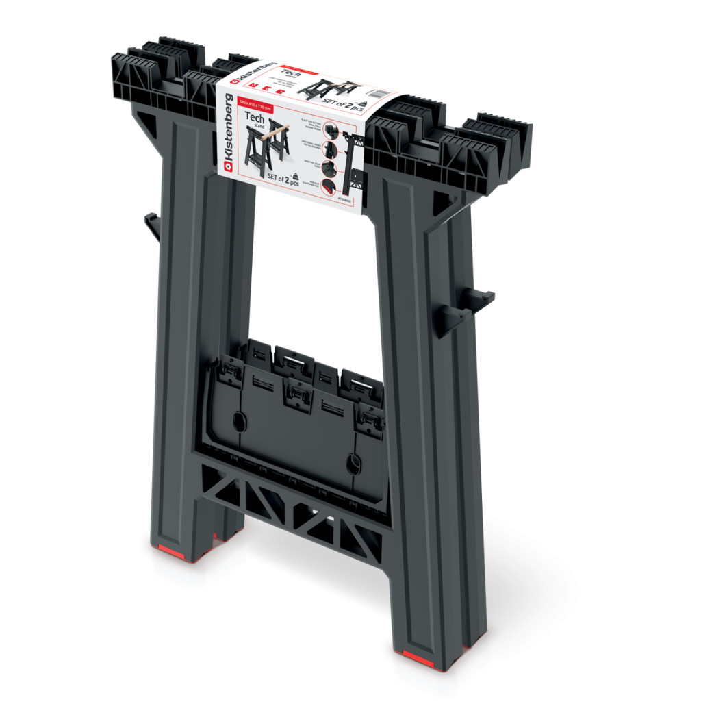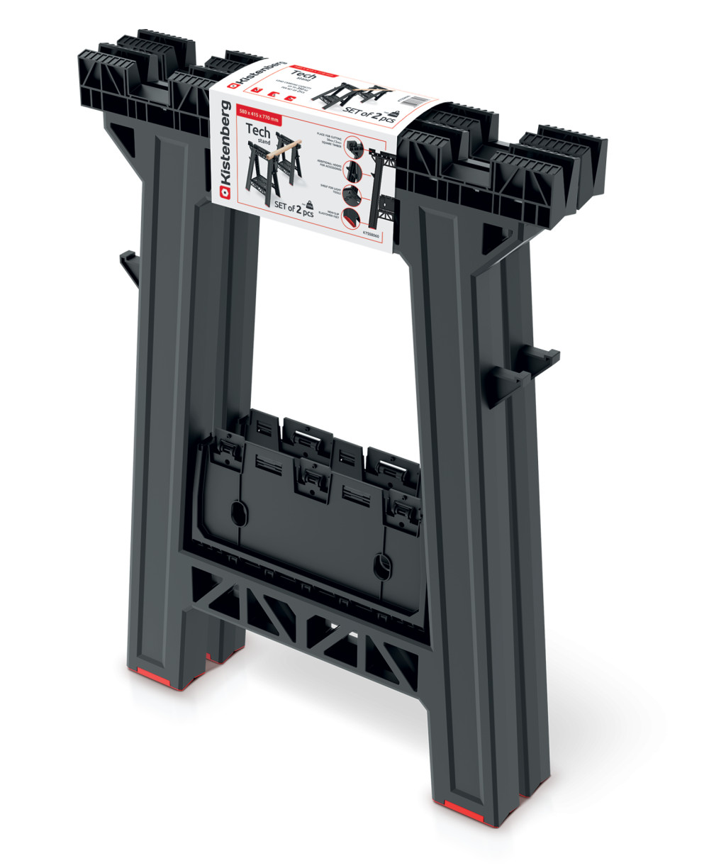 Az állványok praktikus kiegészítőkkel rendelkeznek, mint a négy szerszámtartó kampó és a 32x25 cm-es szerszámtálca, amelyek minden szükséges eszközt karnyújtásnyira helyeznek el. Az elasztomer csúszásgátló talpak stabil alapot biztosítanak minden felületen.