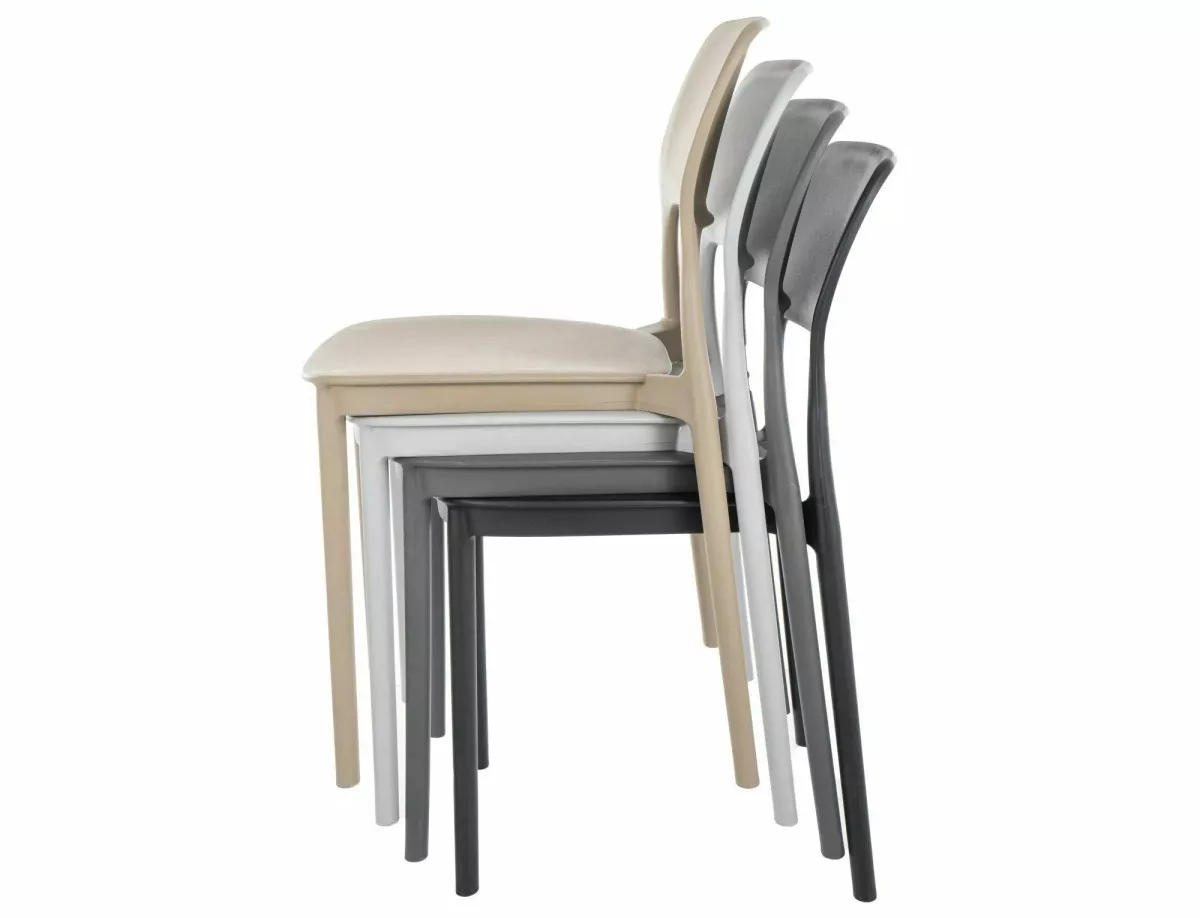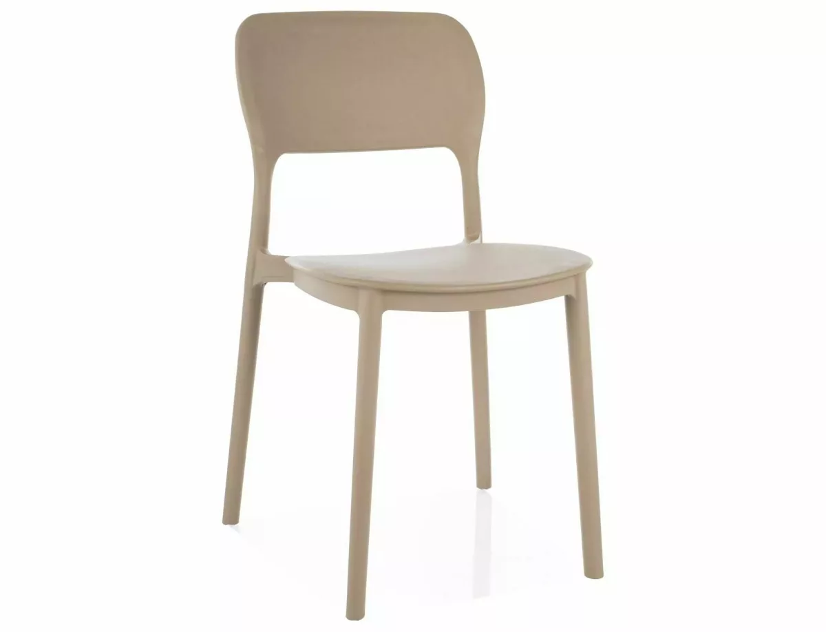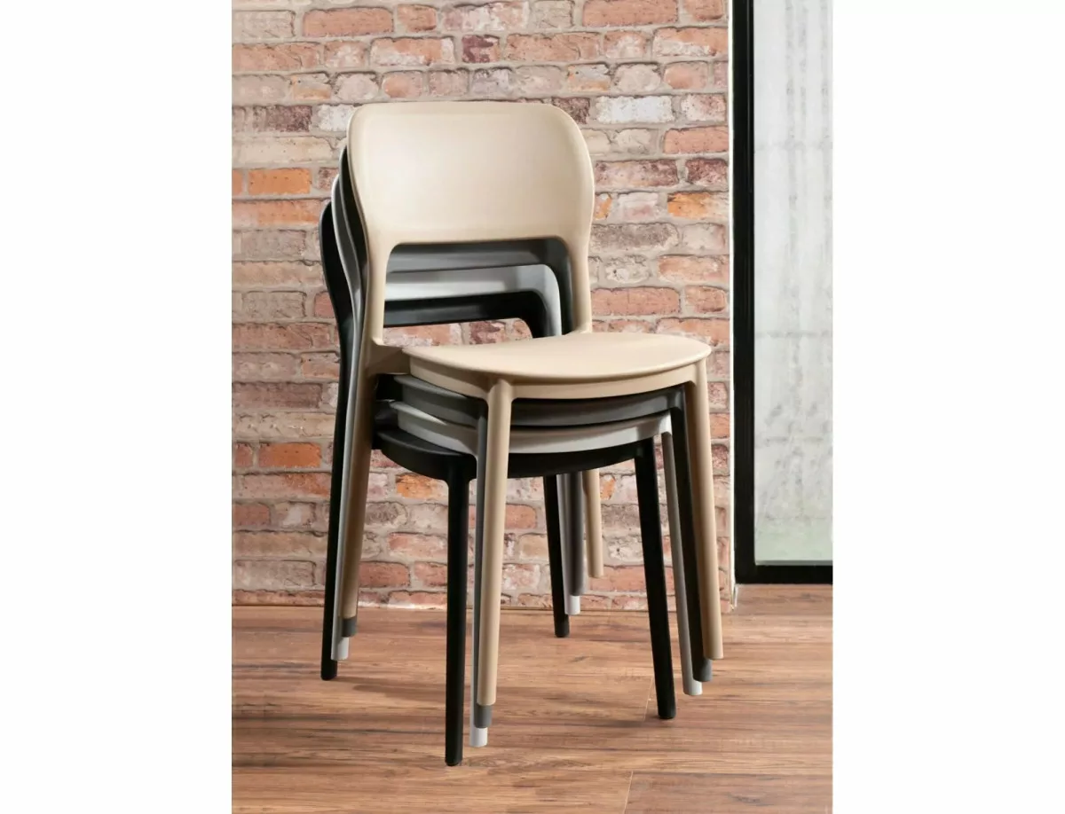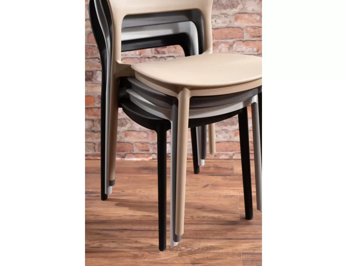Modern, rakásolható PP műanyag szék bézs színben, amely tökéletes választás éttermek, kávézók és egyéb vendéglátóipari egységek számára. Praktikus kialakításának köszönhetően könnyen tárolható és tisztítható.