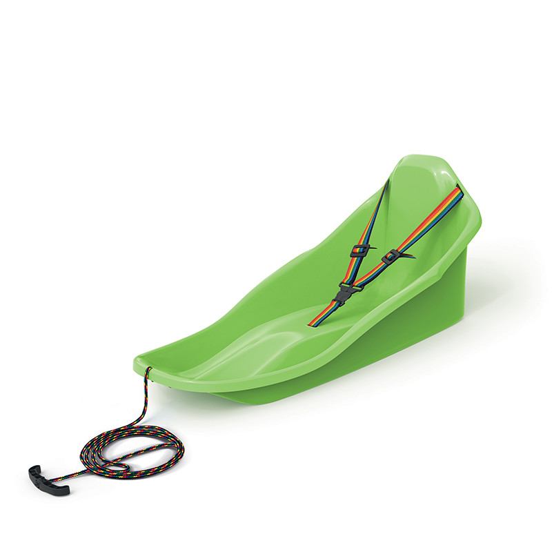 Biztonságos és stabil gyermek szánkó beépített biztonsági övvel, élénk tavaszi zöld színben.