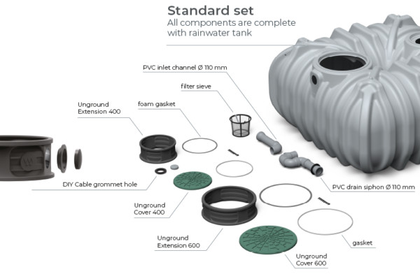 A tartály teljes felszereltséggel érkezik, beleértve a 110 mm-es PVC be- és kifolyócsöveket, szűrőszitát és szifont. A beépített emelőfülek és targonca-bemélyedések megkönnyítik a szállítást és telepítést.