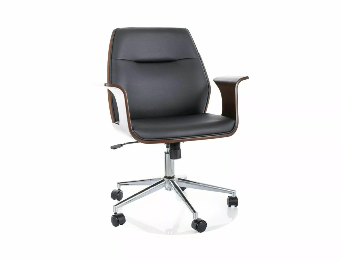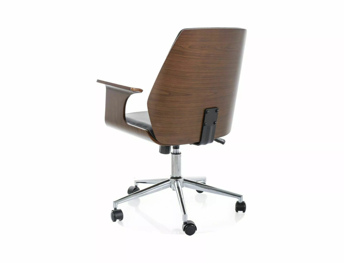 A Vermont forgószék a modern irodai bútorok kifinomult darabja. A fekete műbőr kárpitozás és a dió színű fa elemek harmonikus kombinációja elegáns megjelenést kölcsönöz. A króm váz és az öt görgős talp stabil alapot biztosít, míg a TILT mechanizmus lehetővé teszi a szék dőlésszögének beállítását. A karfa ergonomikus kialakítása és a párnázott ülőfelület hosszú távú kényelmet garantál.