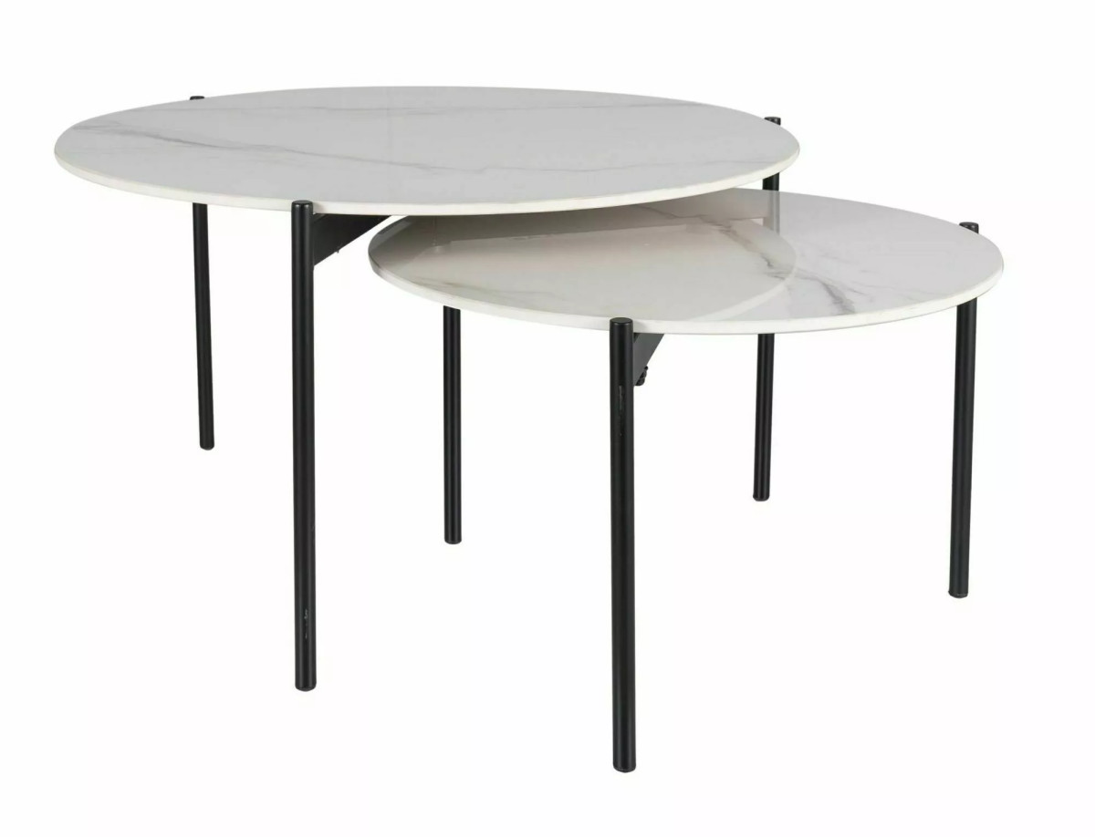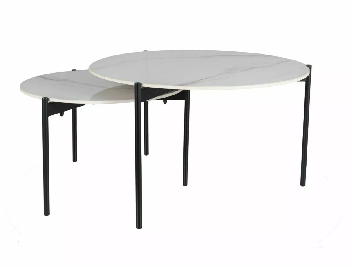 Elegáns kétrészes dohányzóasztal készlet kerámia asztallappal és matt fekete fém vázzal. A nagyobb asztal 80 cm átmérőjű, míg a kisebb 60 cm-es, tökéletes kombinációt alkotva a modern nappalikban.