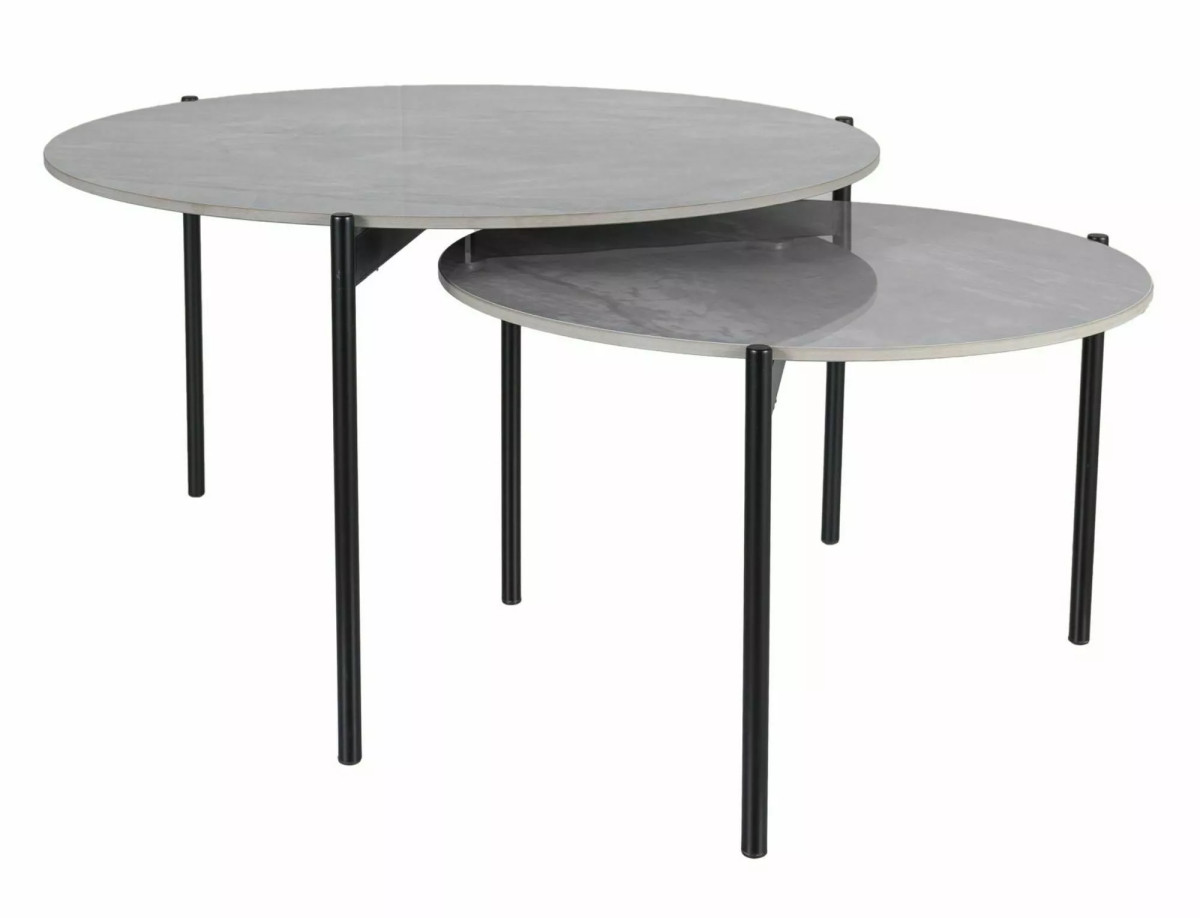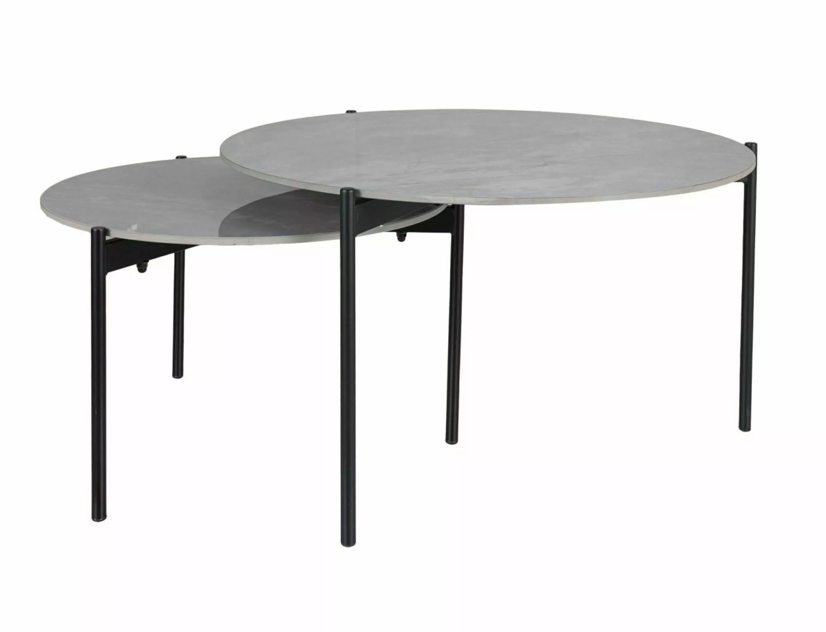Modern és elegáns dohányzóasztal szett kerámia lappal és matt fekete fém vázzal. A két különböző méretű kerek asztal tökéletes kombinációt alkot, és praktikus megoldást nyújt a nappali térhez.