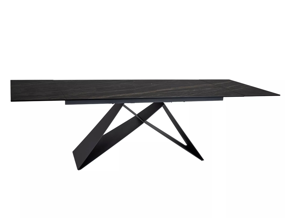 Modern, bővíthető étkezőasztal edzett üveg és kerámia asztallappal, matt fekete fém vázzal. Elegáns megjelenésével és 160-240 cm-es bővíthetőségével akár 12 fő kényelmes étkezését is biztosítja.